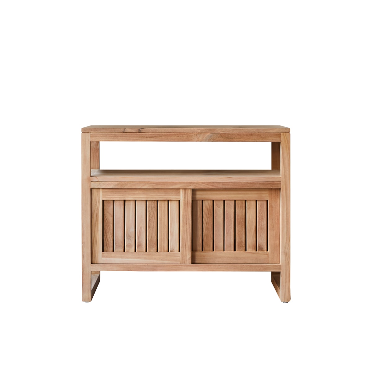 Het Colonial meubel van 90 cm in massief FSC®-gecertificeerd teak combineert een compact ontwerp met een praktische opbergruimte, ideaal voor handdoeken en toiletartikelen.Dankzij zijn modulaire karakter volgt het perfect al uw behoeften: luiertafel, slaapkamermeubel of wastafelmeubel.Het dichte, duurzame teak met warme nuances en natuurlijke elegantie zal u zeker weten te overtuigen.