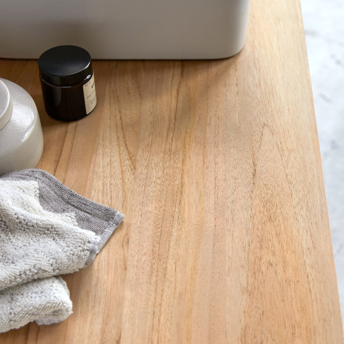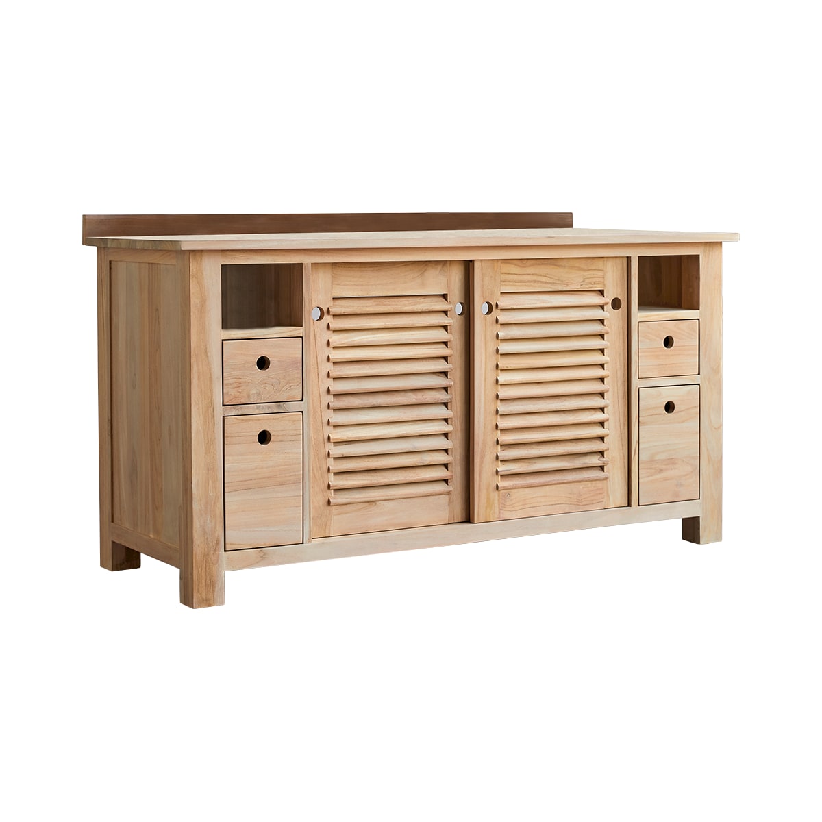 Gewicht: 51 kg- 2 schuifdeuren op metalen rails- Rand van 5 cm aan de achterkant en open achterwand voor een eenvoudige installatie van de leidingen- Achterwand en ladebodems in teakhouten multiplex.