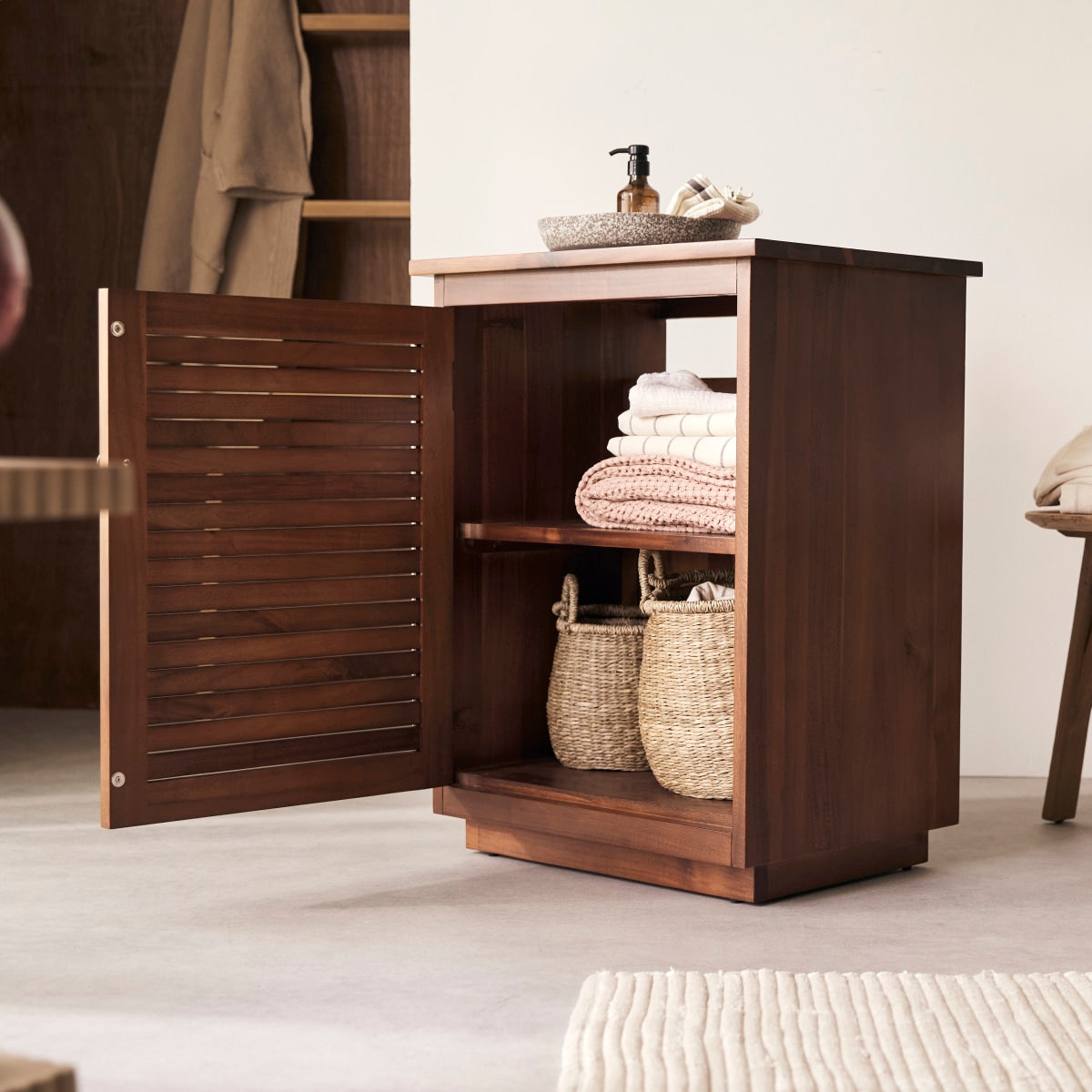 Het Loggia opbergmeubel van 60 cm in massief acaciahout combineert een eigentijdse stijl met praktisch nut, zonder montage. Het is ideaal voor kleine badkamers en combineert perfect met de andere elementen uit het Loggia gamma. Het Loggia badkamermeubel is momenteel nog in productie. Deze foto’s zijn 3D-voorstellingen van hoe het er uiteindelijk zal gaan uitzien. Bekijk gerust de productfiches van hetzelfde gamma om een beter idee te krijgen van de kleur en de kwaliteit van het hout.