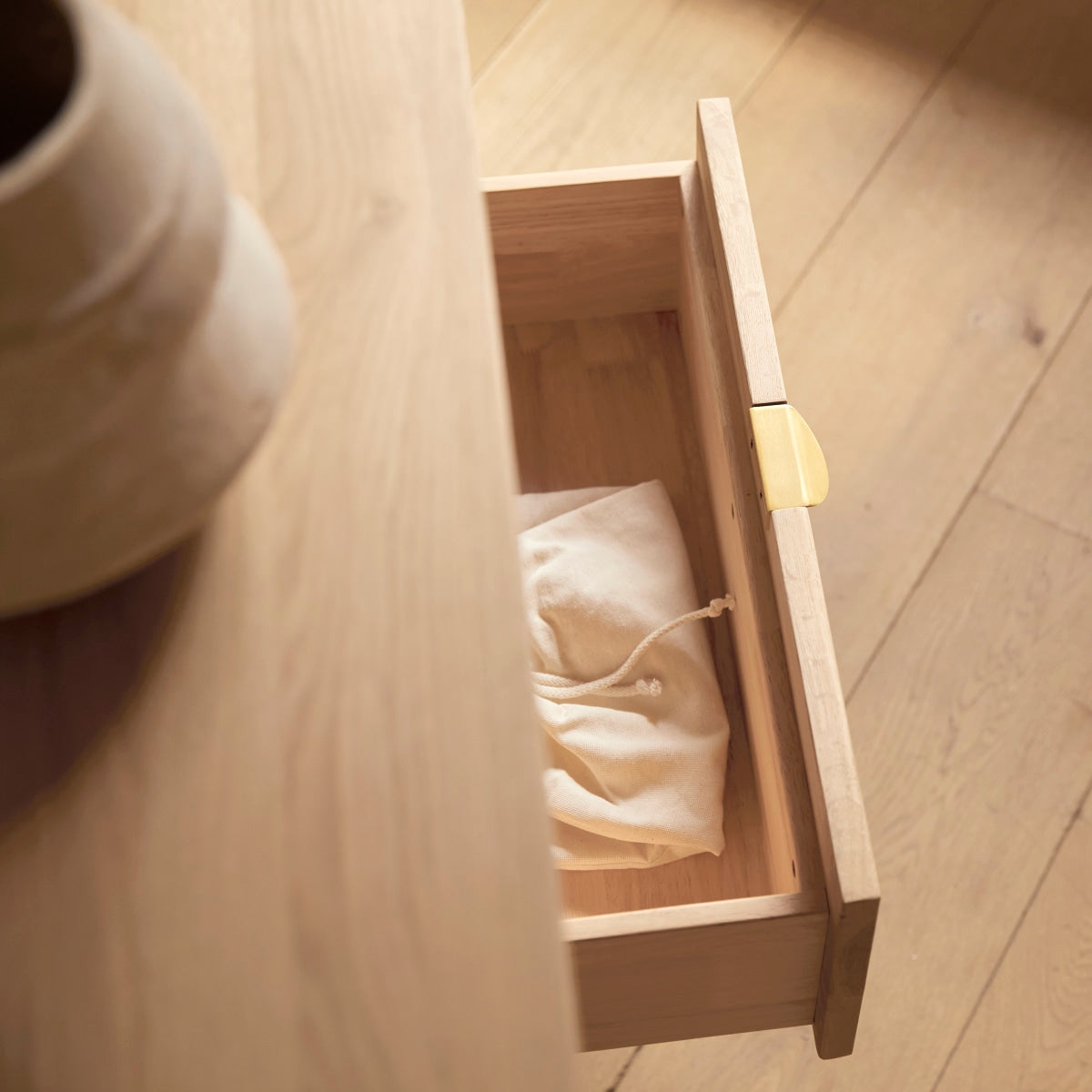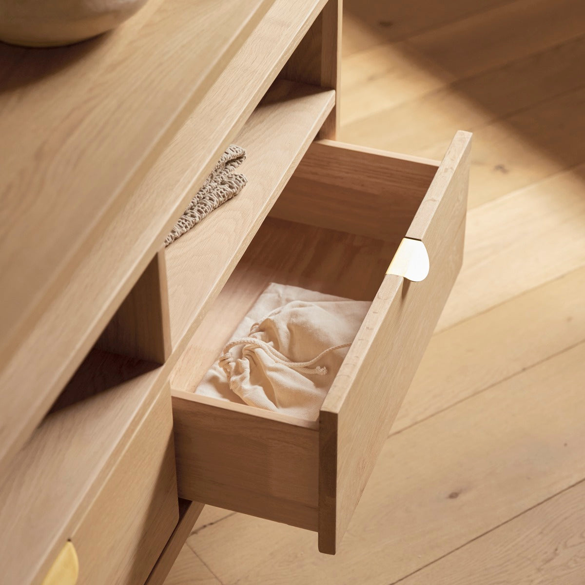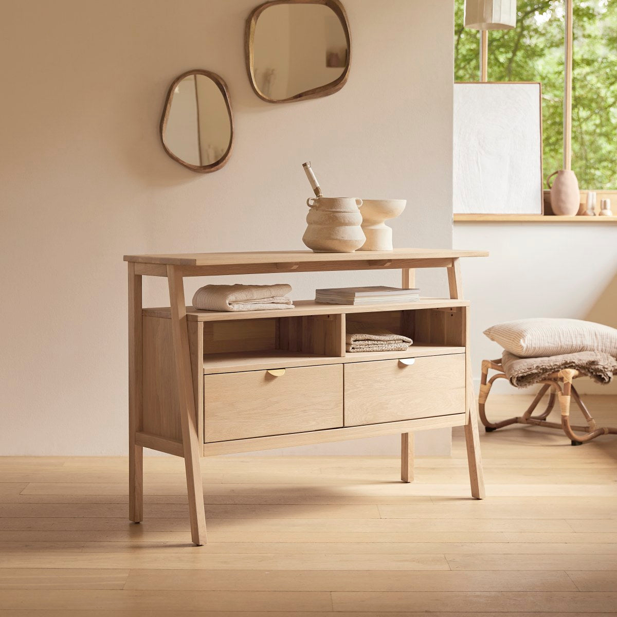 De Pola massief eiken bijzettafel kan gebruikt worden als een klein dressoir, een tv-meubel of een meubel voor de hal, afhankelijk van uw wensen en behoeften! Wij houden van de Scandinavische invloed die tot leven komt in de moderne details zoals de diagonale voet en het verhoogde blad. Wij houden ook van het vak dat het geheel visueel luchtig maakt. De twee vakken en twee grote lades bieden voldoende opbergruimte. De Pola eiken bijzettafel is strak en stijlvol en past overal in huis: in de woonkamer voor accessoires en tijdschriften, in de eetkamer voor serviesgoed of tafellinnen, in de werkkamer voor dossiers, in de slaapkamer voor kleine kledingstukken... zelfs in de gang om tassen op te zetten en mutsen, hoeden en handschoenen in op te bergen.