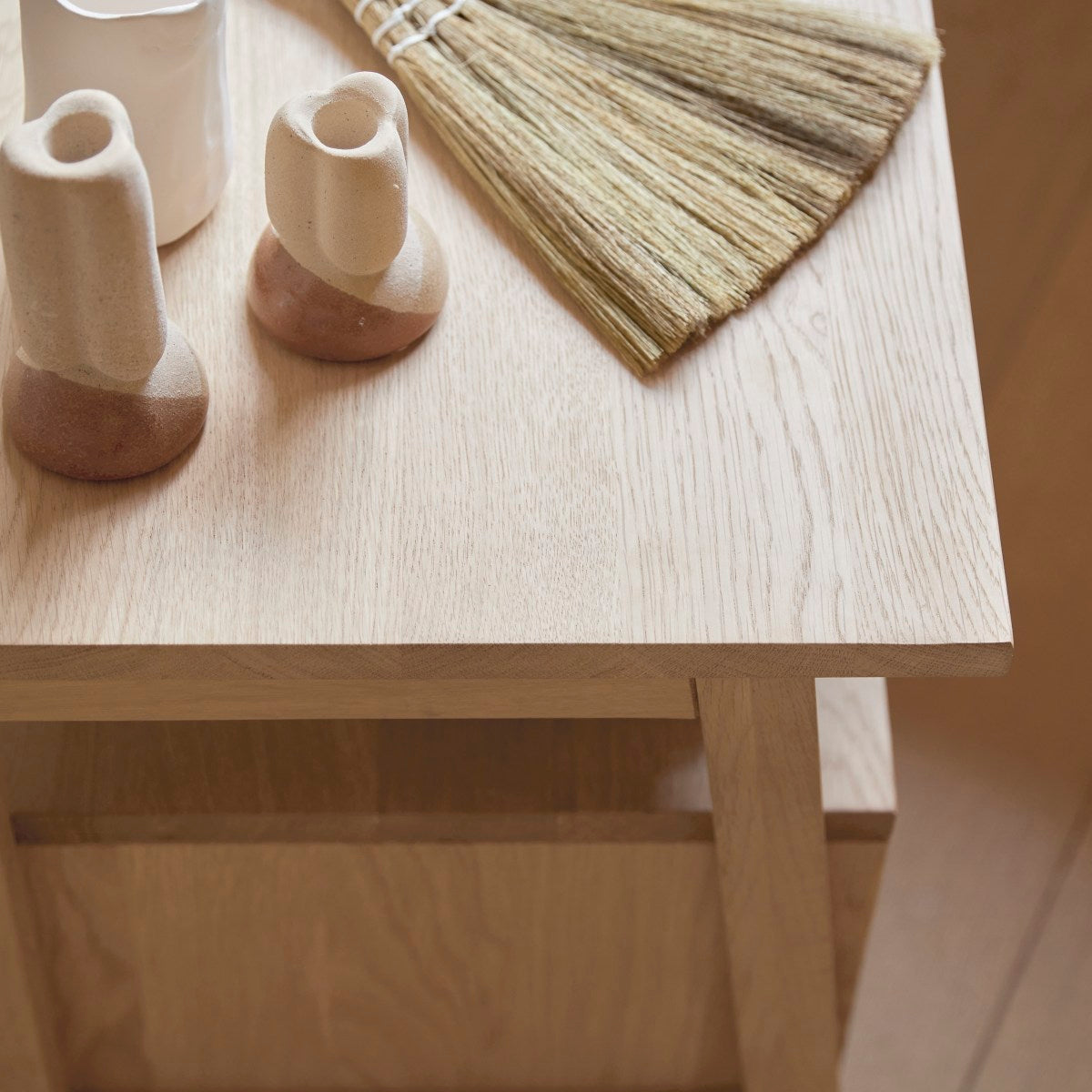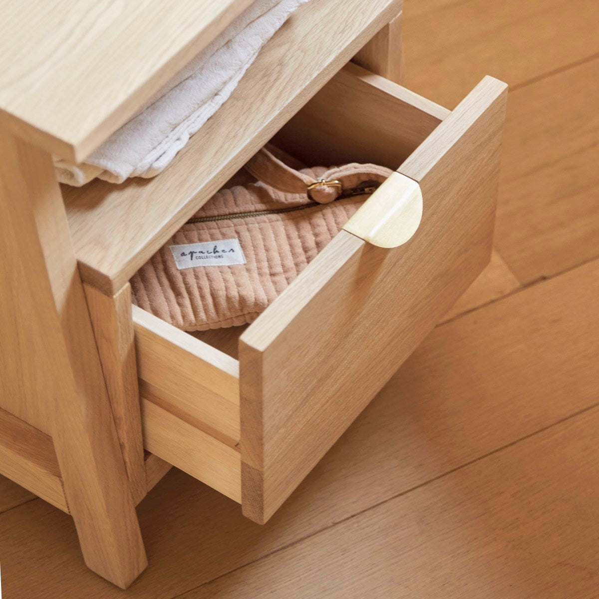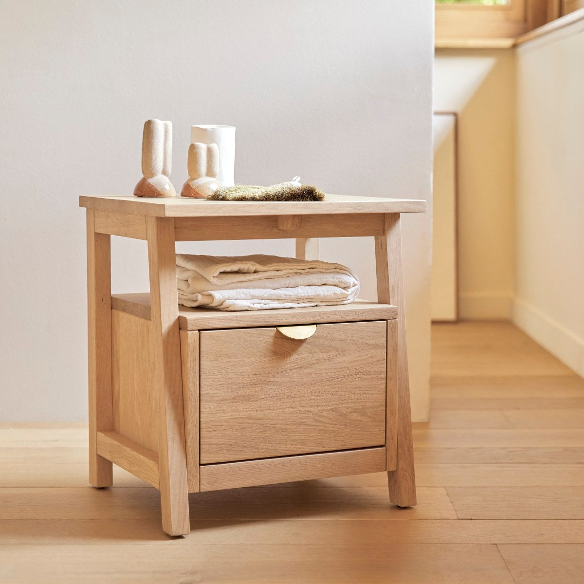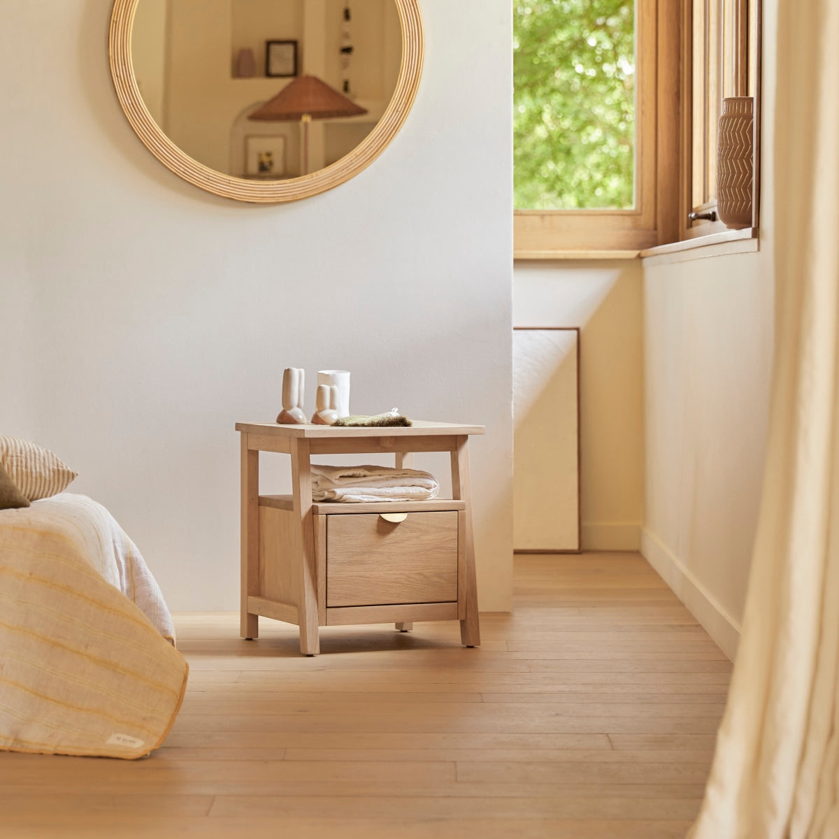 Dit eiken nachtkastje vervolledigt ons eikenhouten meubelassortiment Pola met zijn populaire Scandinavische invloed. En als deze tijdloze charme van authentieke meubelen uw ding is, aarzel dan niet onze Naturel-collectie te ontdekken of te herontdekken.