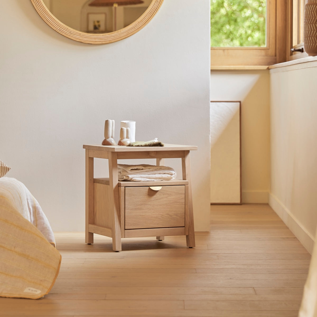 Het Pola massief eiken nachtkastje. Wij houden van de soberheid van zijn Scandinavisch geïnspireerde lijn, het ontwerp van zijn schuine basis en de grote lade om kleine en grote geheimen te verbergen. Aarzel niet dit nachtkastje te combineren met de bestaande decoratie van uw slaapkamer; de blondheid van het hout en de zuiverheid van de contouren laten alle associaties toe.