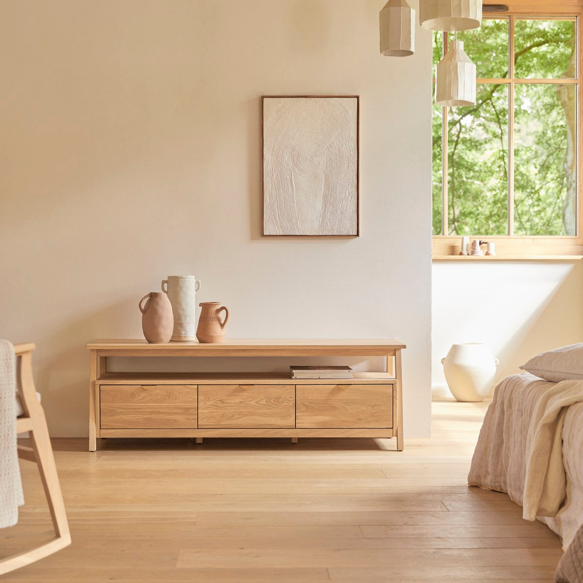 Het eiken tv-meubel Pola is zo mooi dat u het bijna zonder televisie in de woonkamer zou zetten! Het is echter een zeer praktisch tv-meubel met een Scandinavisch design vol karakter: Het vak met het verhoogde tafelblad en de diagonale basis geven het veel persoonlijkheid! In de 3 grote lades kunt u al uw multimedia-apparatuur organiseren en in het vak kunt u uw tijdschriften of platte apparaten kwijt zoals readers, laptops, tablets …