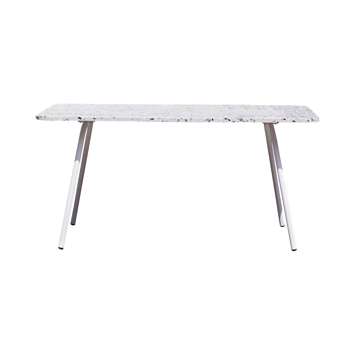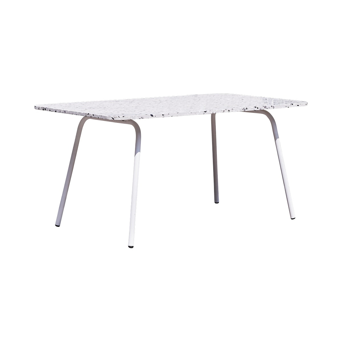 De rechthoekige, witte tafel van premium terrazzo en metaal Elio brengt licht in uw keuken, eethoek of eetkamer! Deze hedendaagse elegante tafel heeft een gespikkeld blad van premium terrazzo met een subtiele glans en een schuin gegalvaniseerd ijzeren onderstel, helemaal in lijn met moderne ontwerpeisen. De tafel kan makkelijk worden schoongemaakt met een vochtige spons en biedt plaats aan 6 personen tijdens het eten. Ideaal in combinatie met de witte metalen Arty-stoelen of de witte metalen Arty-armstoelen. Ook verkrijgbaar met een grijs onderstel of een rond plateau voor kleinere ruimtes.