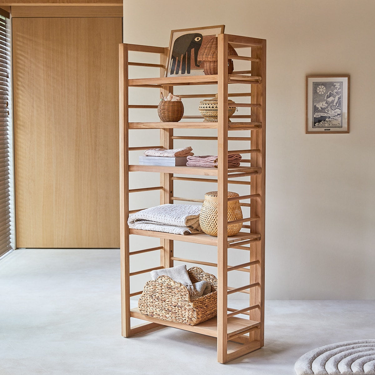Met de massief teakhouten hoge boekenkast Sera kan uw kind al zijn schatten leren organiseren: De dingen die uw kleintje niet vaak gebruikt of bijzonder goed wil beschermen gaan naar boven... Nu heeft het nog de hulp van mama of papa nodig om spullen naar beneden te halen, maar over een paar jaar kan uw kind het gewoon zelf. In het midden is er plaats voor de spelletjes of het speelgoed waar het kind dol op is en wat het zelf kan opruimen, en onderin staan dozen om kleine dingen in op te bergen. Op latere leeftijd zet de tiener er zijn boeken en schoolspullen in neer of maakt er een multimediastelling van. De massief teakhouten boekenkast Sera is ook verkrijgbaar in een lage uitvoering. Het meubel staat mooi bij ons assortiment in natuurlijke stijl, een serie meubels met authentieke en tijdloze charme.