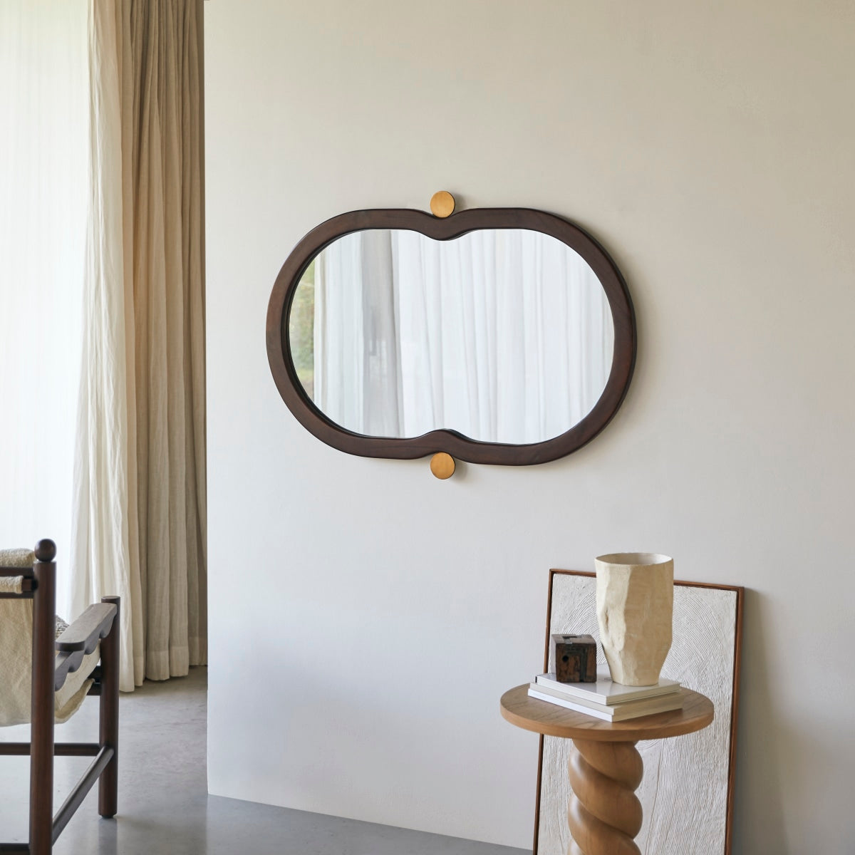 De Agate spiegel in massief mindi is geïnspireerd door de brutalistische stijl en combineert sterke materialen en zachte lijnen. Het resultaat is een organisch silhouet dat zeer gewaardeerd wordt in hedendaags design.