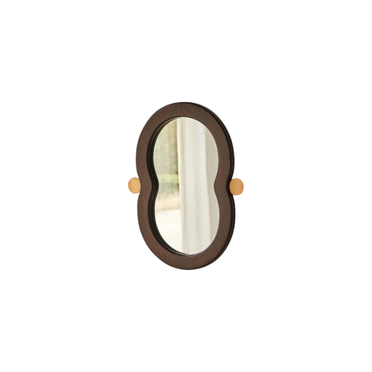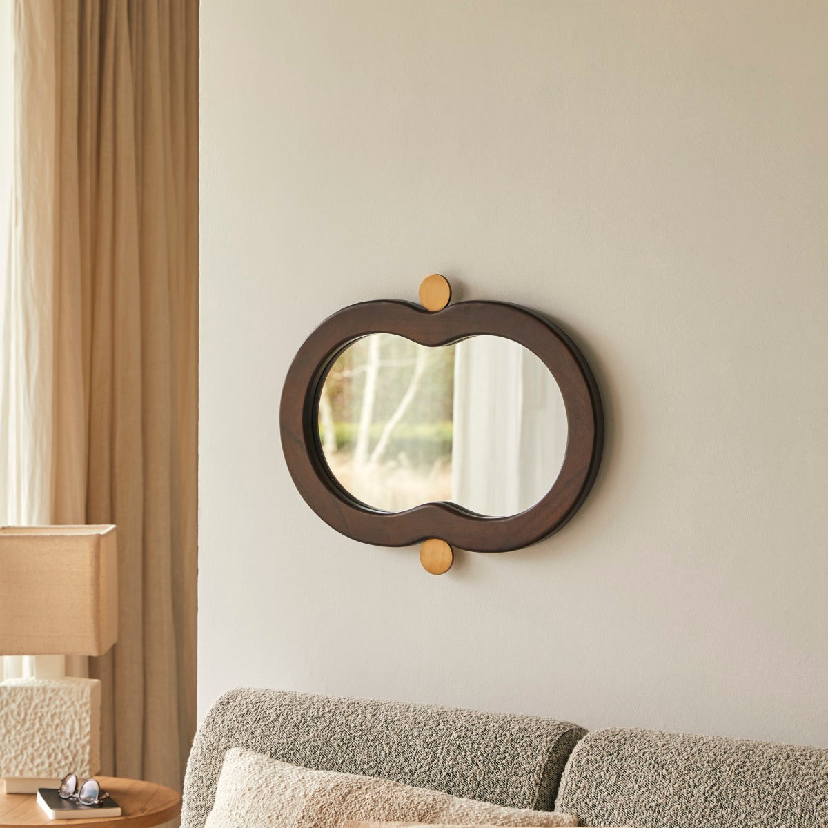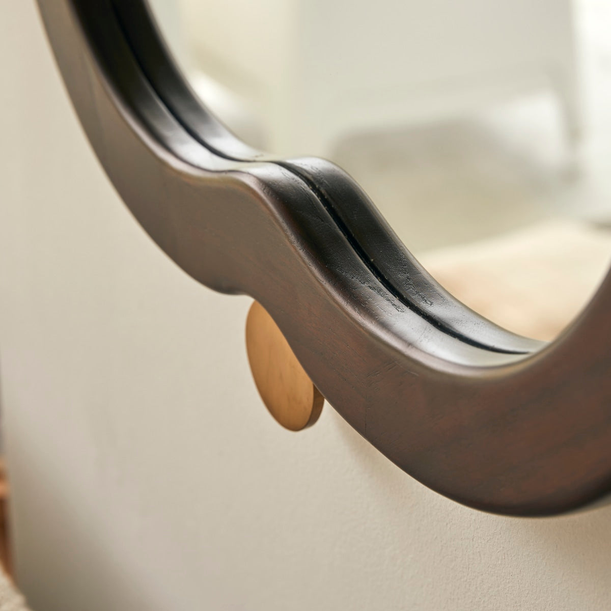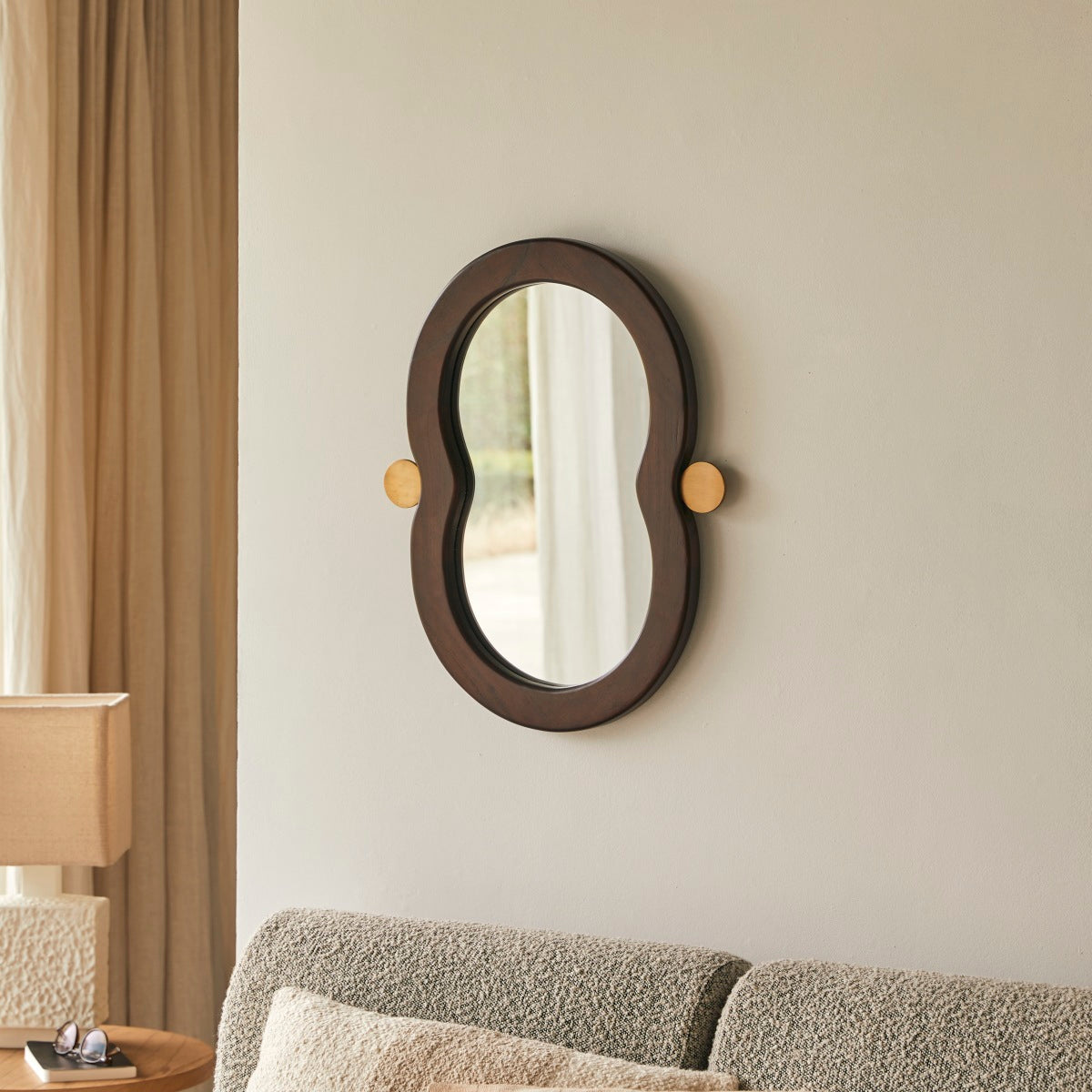 De Agate spiegel in massief mindi is geïnspireerd door de brutalistische stijl en combineert robuuste materialen met een zacht, organisch ontwerp vol charme, ideaal voor eigentijdse interieurs.