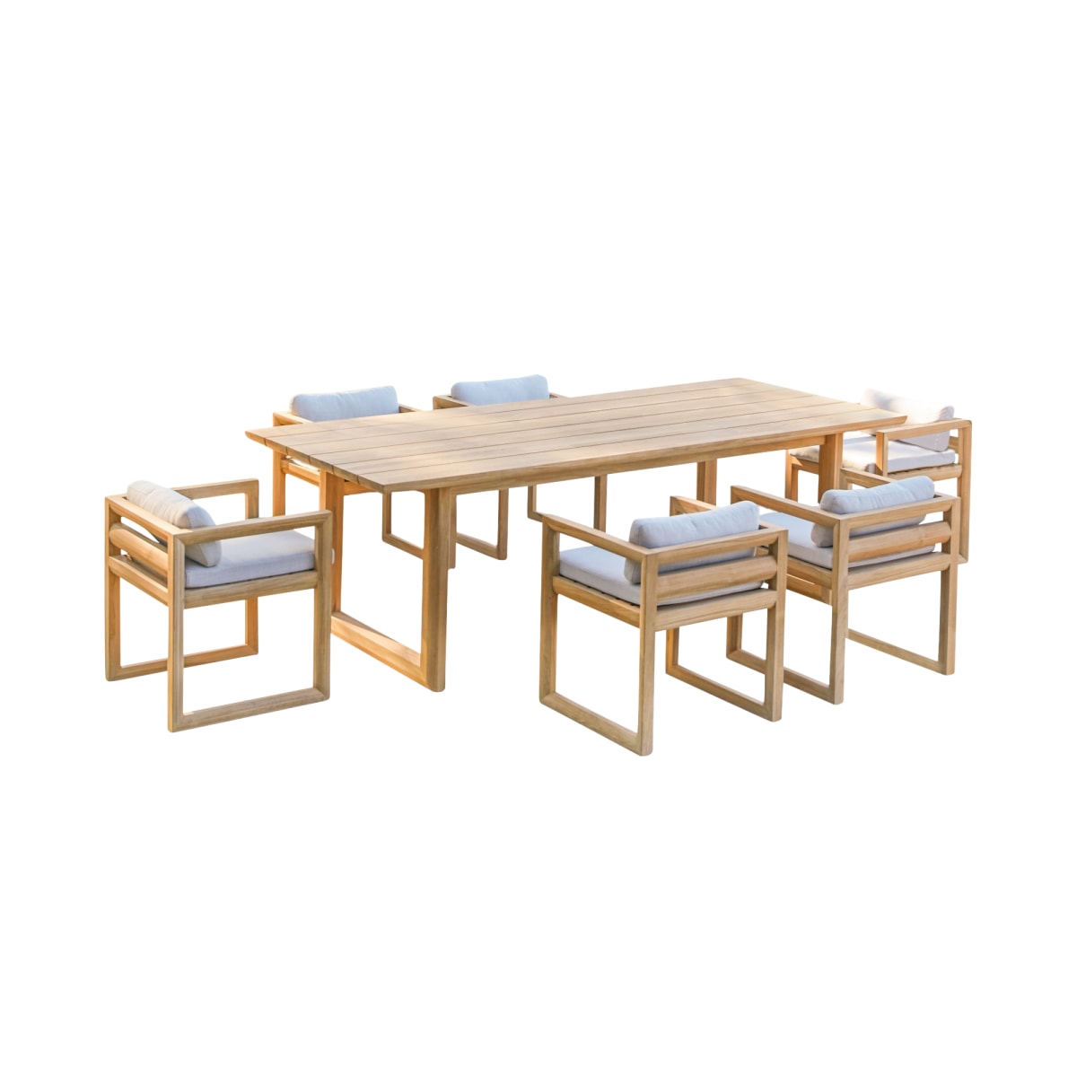 Met 6 stoelen en een grote tafel biedt hij plaats aan 6 tot 8 gasten. Deze stevige, duurzame meubels zijn ideaal voor buitengebruik en weerbestendig. De stoelen bieden optimaal comfort dankzij hun waterdichte kussens met afneembare hoes.