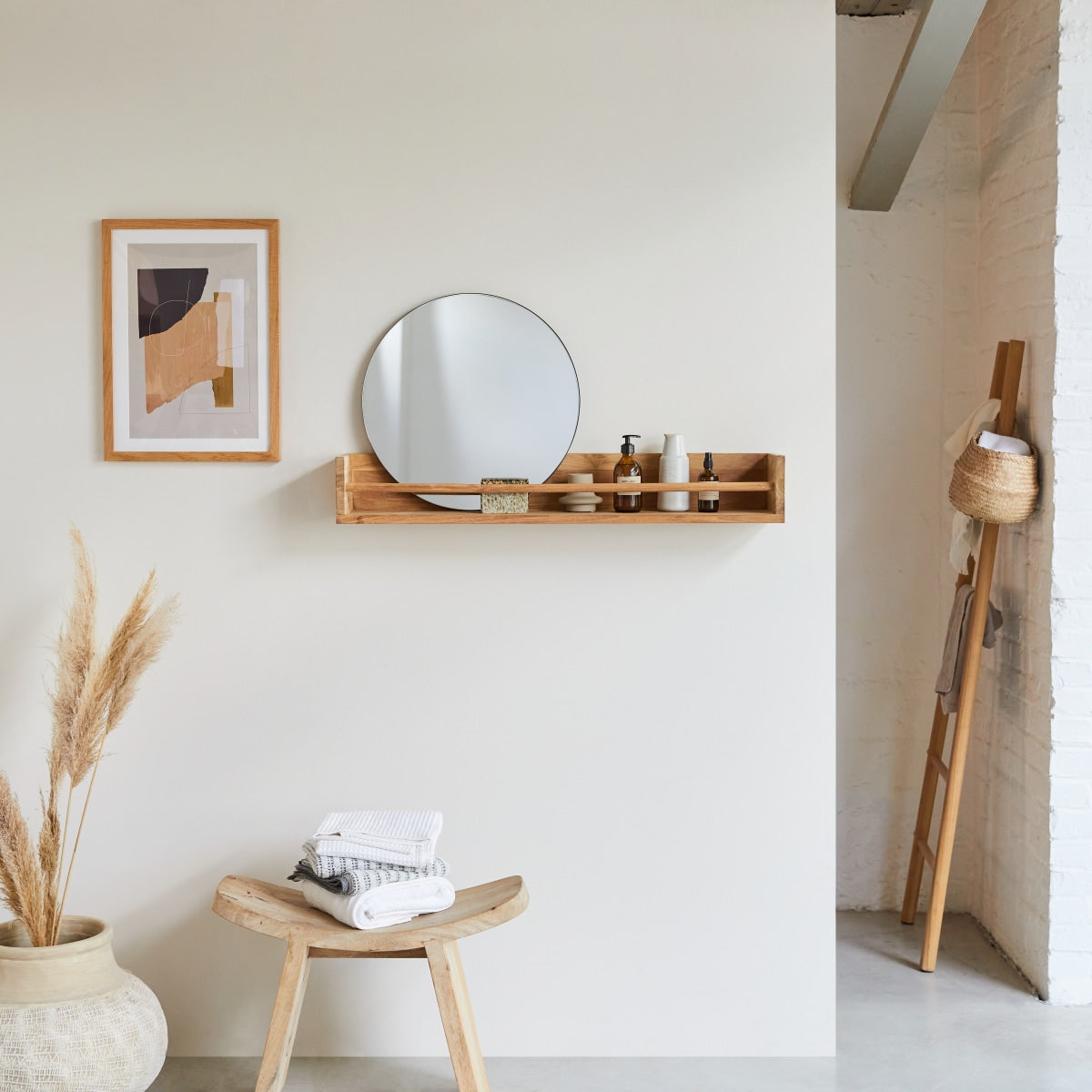 Dit Ugo 100 rek van massief teakhout met een prachtig design is ideaal voor flesjes en andere toiletartikelen maar ook kleine planten, spiegels en decoratieve voorwerpen staan er perfect op.
