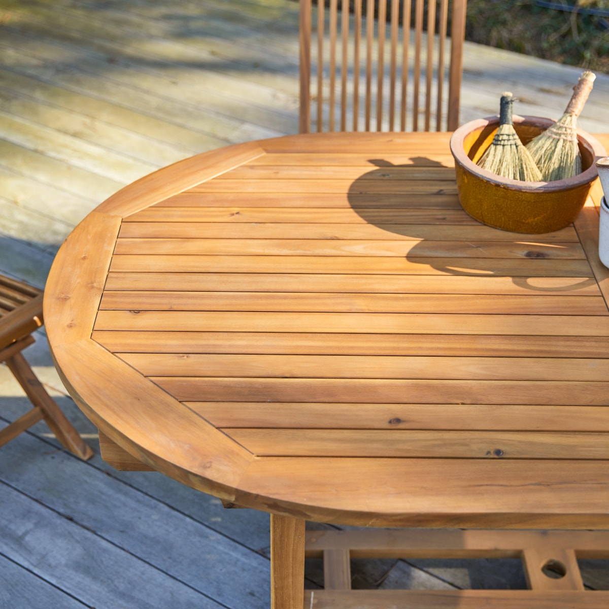 Onze ovale buitentafel Capri van massief acacia is aangenaam ruim en biedt plaats aan maximaal 9 gasten - voor zowel gezellige etentjes als feestelijke gelegenheden! De moderne elegante stijl komt tot uiting in de kenmerkende rondingen en wordt effectief onderstreept door het aantrekkelijke lattenontwerp en het reeds geoliede, goudglanzende hout. Combineer hem zoals u wilt - ofwel met onze tweedelige massief acaciahouten stoelen, of in mix & match-stijl met andere design-stoelen uit onze collectie! Het acaciahout is FSC®-gecertificeerd, uw garantie dat het afkomstig is uit duurzaam beheerde bossen.