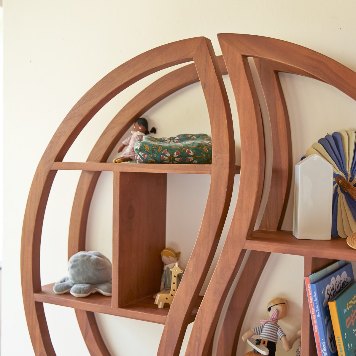 Boven het bureau of naast het bed is de massief teakhouten Ying Yang-plank als rustgevende, ontspannende muziek in de slaapkamer: hiermee kunnen kinderen mooie verhalen verzinnen over verre horizonten en over de wildste dromen. De vorm doet denken aan het yin yang-symbool van evenwicht en volstrekt innerlijke rust: kinderen zullen met plezier hun favoriete creaties, boeken of bordspellen tentoonstellen. De massief teakhouten Ying Yang-plank is behandeld met een beschermend vernis. Het stuk maakt deel uit van onze neo-etnische serie, meubels die uitnodigen om te reizen.