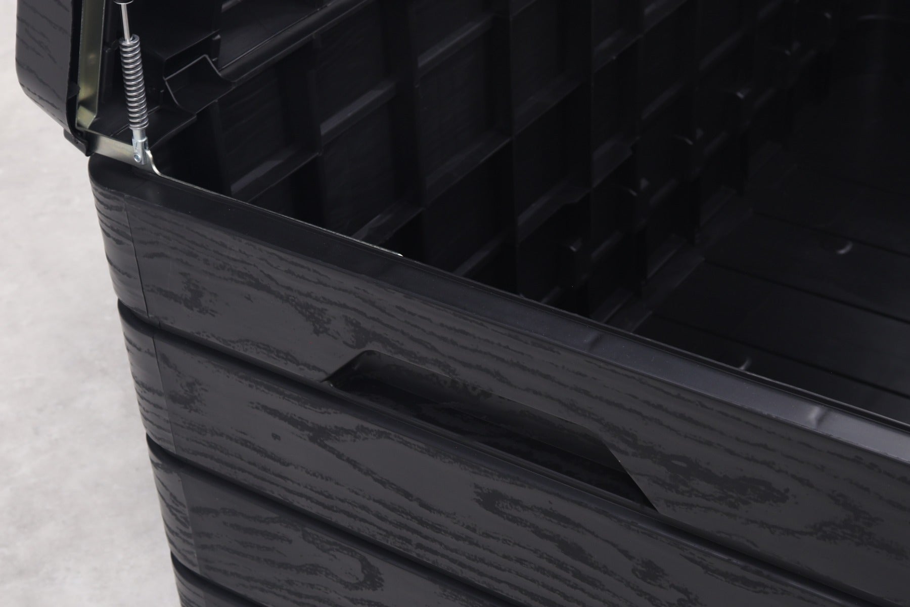 Met een inhoud van 640 liter is deze ruime opbergbox perfect voor het opbergen van tuinkussens, accessoires of gereedschap. De box is gemaakt van licht en duurzaam kunststof met een mooie houtlook, wat zorgt voor een praktische én stijlvolle uitstraling. Je kunt de box afsluiten met een hangslot (niet inbegrepen), zodat je spullen veilig opgeborgen blijven.