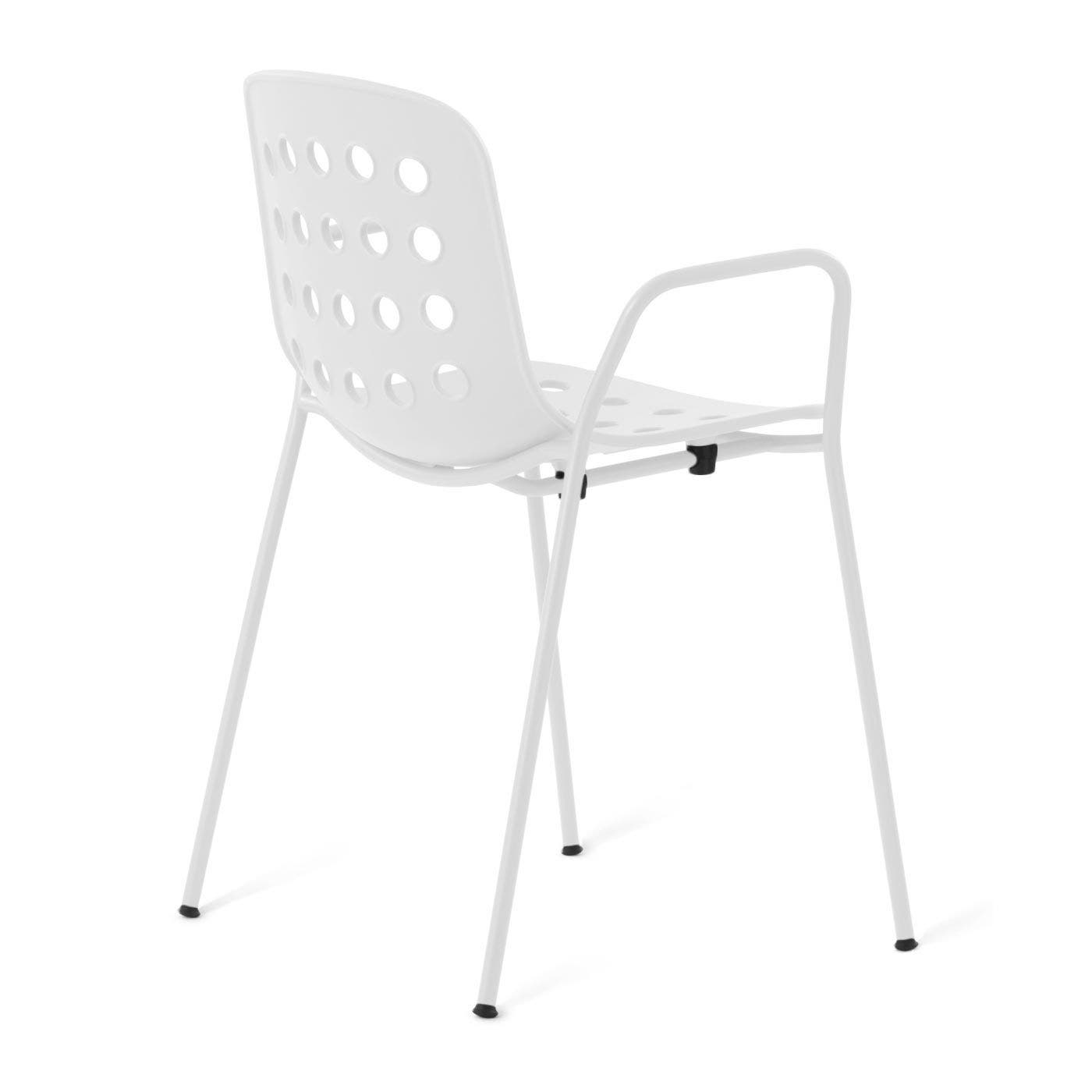 Het elegante Italiaanse design en de ronde gaten in de zitting van deze designstoel maken hem sportief en vederlicht. De holi holes armstoel heeft zitting van kunststof en een metalen onderstel met armleuningen. Ontwerper Simone Viola maakte van de holi stoel een ideaal midden tussen een binnen- en buitenstoel. De door-en-door gekleurde kunststof zitting en het gepoedercoate onderstel van deze armstoel hebben dezelfde kleur en vormen zo één geheel. holi holes is leverbaar in het wit en het zwart.