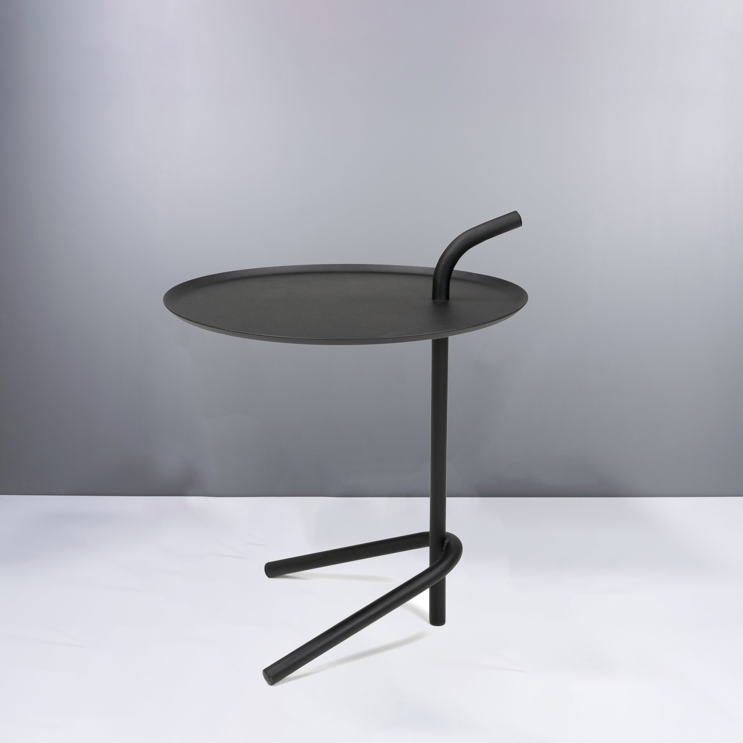 De MERLIN is een bijzettafel die makkelijk te verplaatsen is. Doordat het frame doorloopt door het blad ontstaat er een handvat. De driepotige voet geeft een strak design aan het ontwerp. De bijzettafel is gemaakt van staal en afgewerkt met een zwarte poedercoat laag.