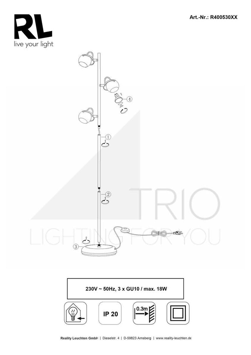 Lichtbron De vloerlamp heeft een gu10 fitting en wordt zonder lampje(s) geleverd. De vloerlamp is geschikt voor 3 led, halogeen, gloei of spaar lichtbron(nen) van maximaal 18.0 watt.