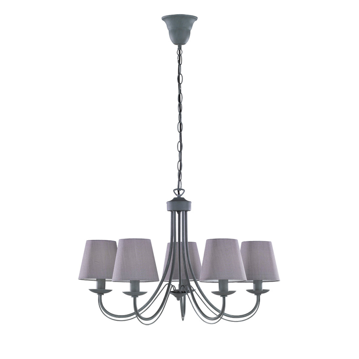 Kroonluchter Cortez, die het interieur een exclusief tintje geeft met zijn betonlook. Fleur je interieur op met deze prachtige kroonluchter. Het scharnier van de lamp is van metaal en de kappen zijn van stof.