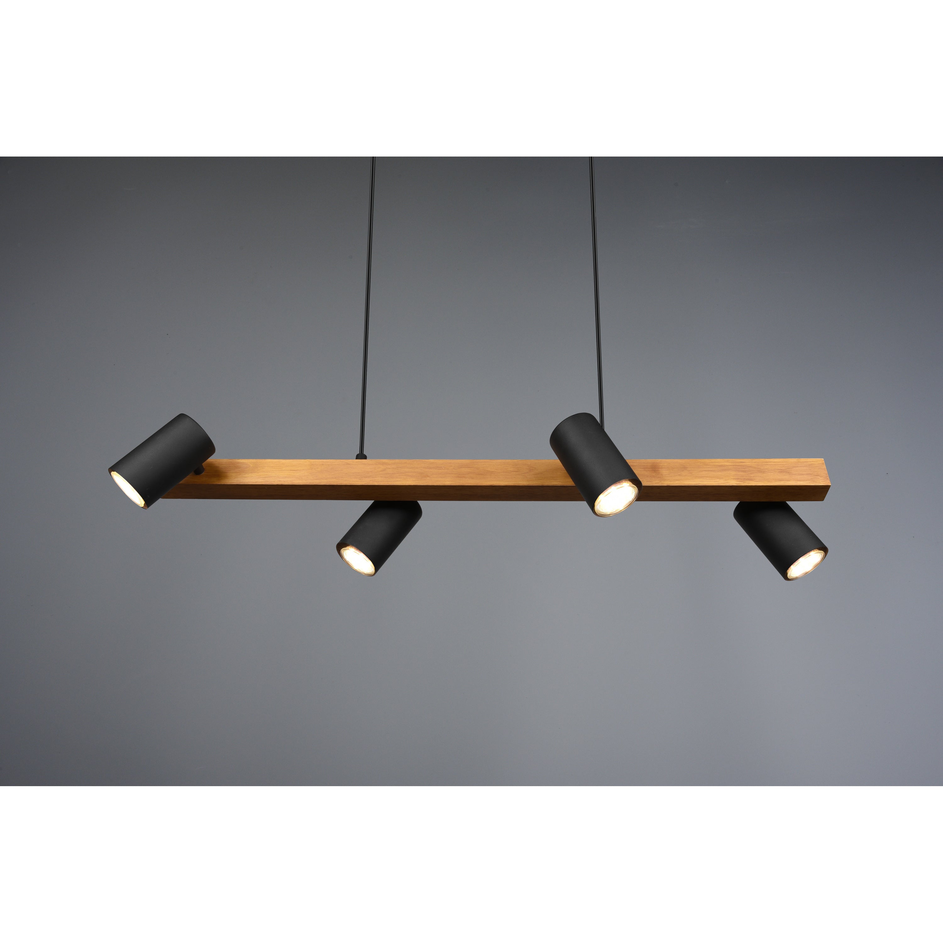 De hanglamp Marley van het merk Trio Leuchten is een fraaie en functionele hanglamp. Deze hanglamp is uit gevoerd met 4 draaibare kappen in het zwart, het armatuur is in een hout kleur. De doorsnee van de hanglamp Marley is 80 x 18 centimeter en heeft een GU10 fitting die geschikt is voor vele licht sterkten. Een mooie hanglamp die in veel interieurs past en zeker een eyecatcher is. Deze lamp wordt geleverd exclusief lichtbronnen.