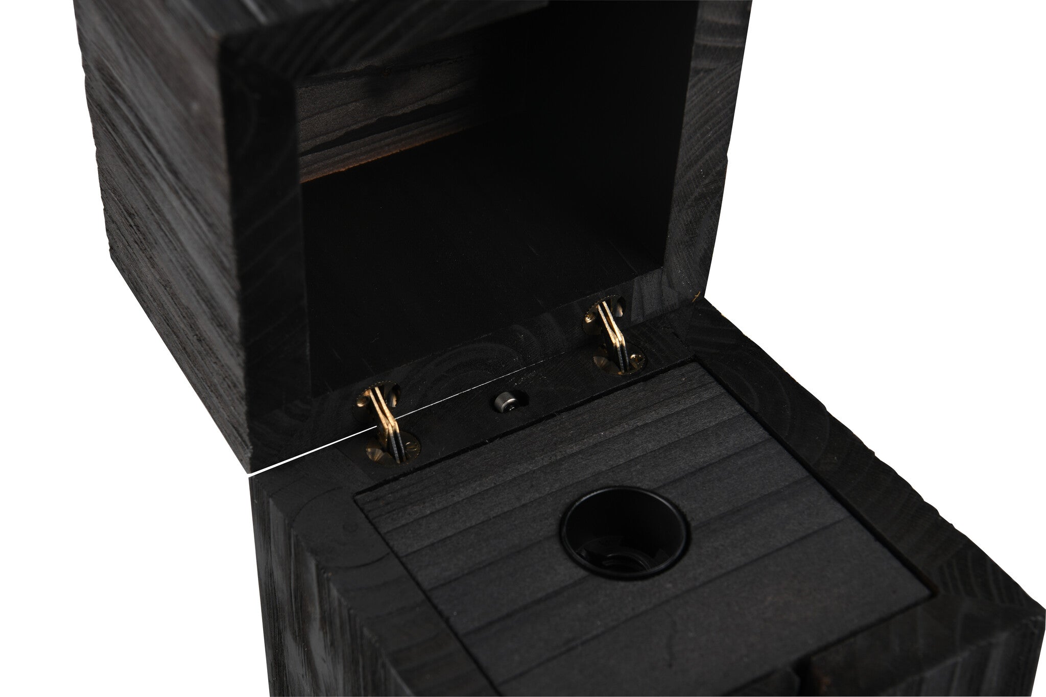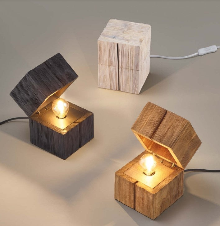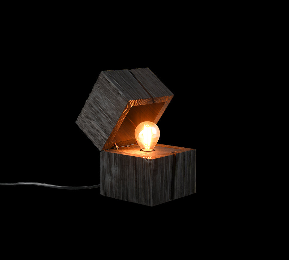 In gesloten toestand verbergt de scharnierende houten kubus de vervangbare E14 LED-lamp, die via een contact inschakelt zodra de deksel omhoog wordt geklapt.