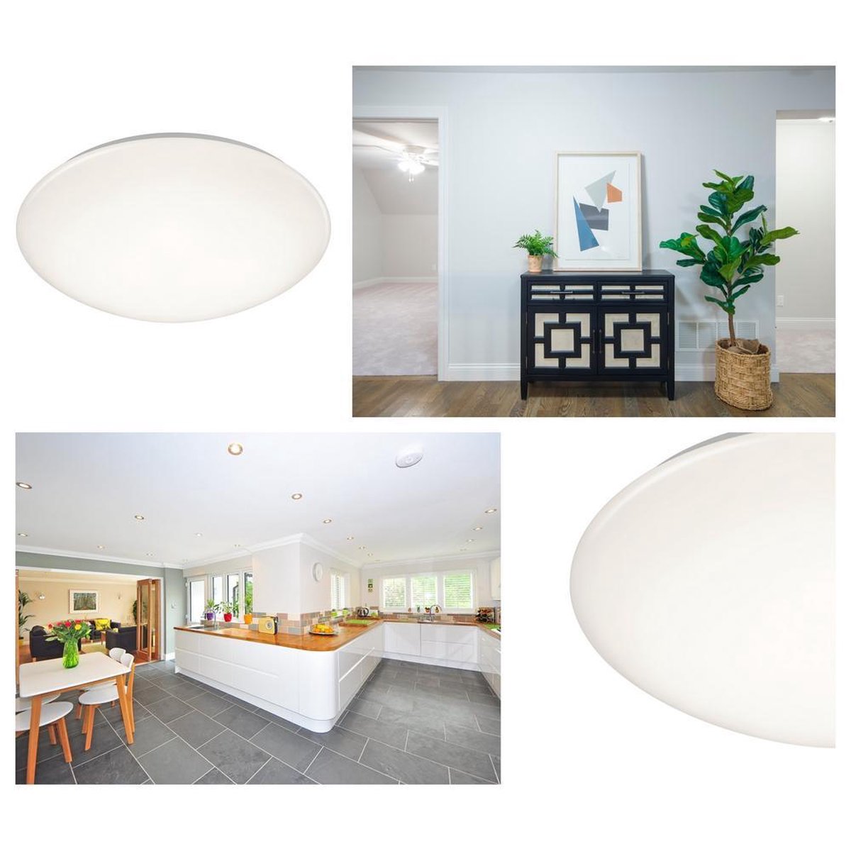 De plafonnière heeft de kleur wit en is gemaakt van kunststof.
