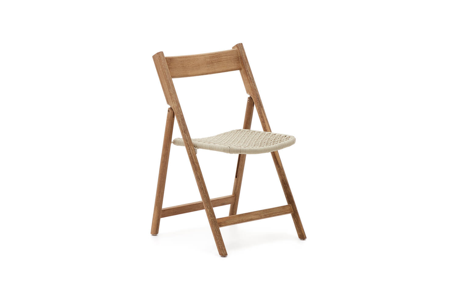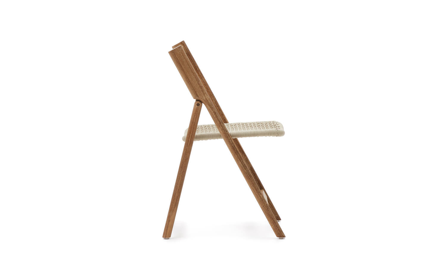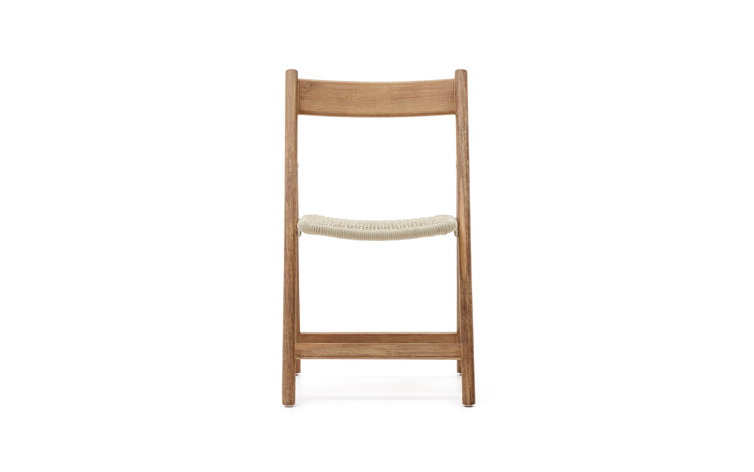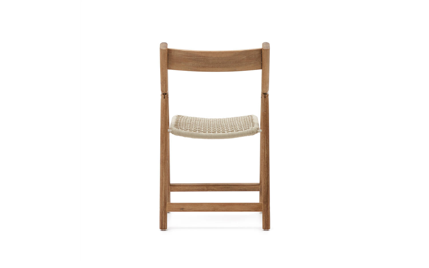 Blankgelakte tuinstoel Dandara valt op door de fraaie houtnerf en het rustieke touwwerk dat de natuurlijke uitstraling versterkt. De neutrale kleur past moeiteloos bij andere tuinmeubelen en tuinaccessoires. Deze vouwstoel is niet alleen praktisch, maar voegt ook direct sfeer toe aan je buitenruimte.