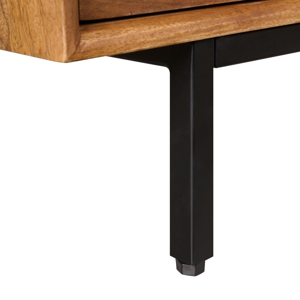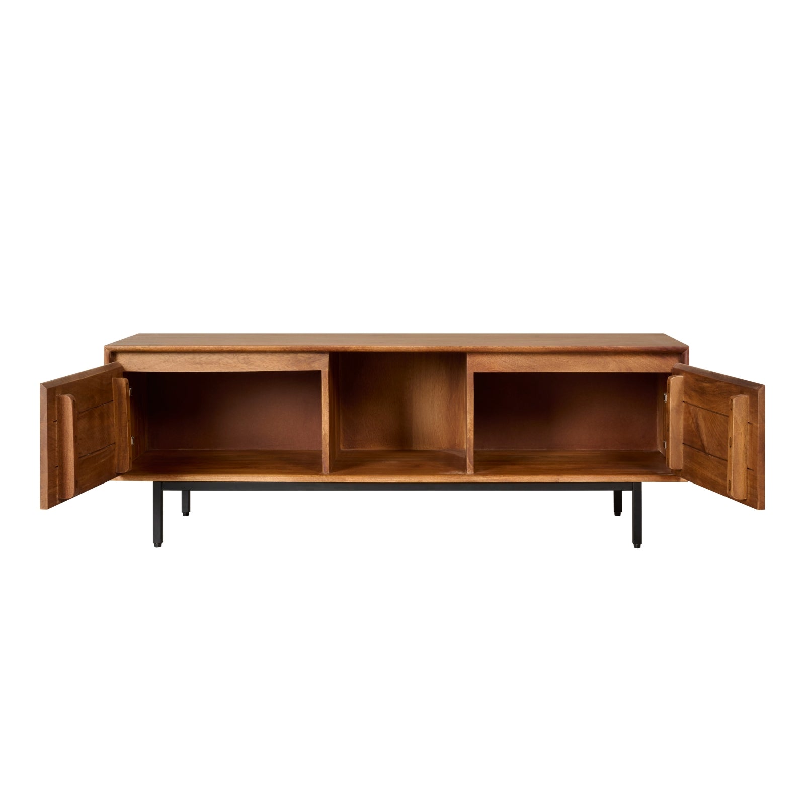Het tv-meubel Vegas heeft afmetingen van 130 cm in de breedte, 40 cm in de diepte en 45 cm in de hoogte. Het meubel is vervaardigd uit massief mangohout met een honingkleurige afwerking. Mango is een duurzame houtsoort met een prachtige nerftekening, waardoor elk meubelstuk uniek is. Het onderstel is gemaakt van metaal met een zwarte poedercoating.