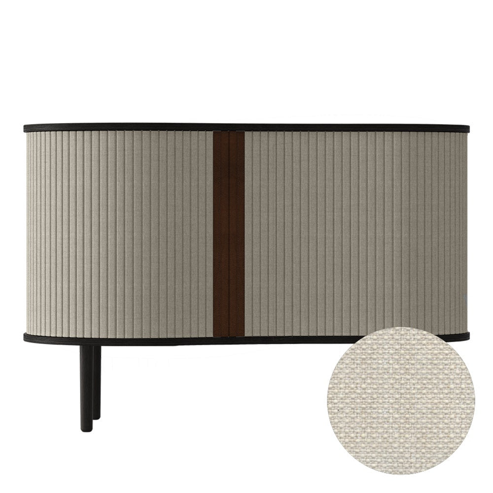 Deze opbergkast heeft een frame gemaakt van eikenhout en twee schuifdeuren met een stoffen bekleding De bekleding komt uit de Horizons collectie van Umage en is 100% gerecycled De Audacious cabinet kun je vrij neerzetten omdat je de deurtjes helemaal rondom kunt schuiven Hierdoor kun je op ieder moment een nieuw display voor al jouw favoriete spullen creeren Door de organische vormen van deze eikenhouten kast is het een echte blikvanger en door de mooie ronde hoeken past deze kast in iedere ruimte Dankzij de combinatie van het houten frame en de stoffen bekleding krijgt de opbergkast een warme uitstraling De middelste plank in het kastje heeft een kleine ronde opening, zodat ook hoge glazen of vaasjes in het kastje passen Deze design opbergkast is niet alleen prachtig om te zien, maar ook erg functioneel