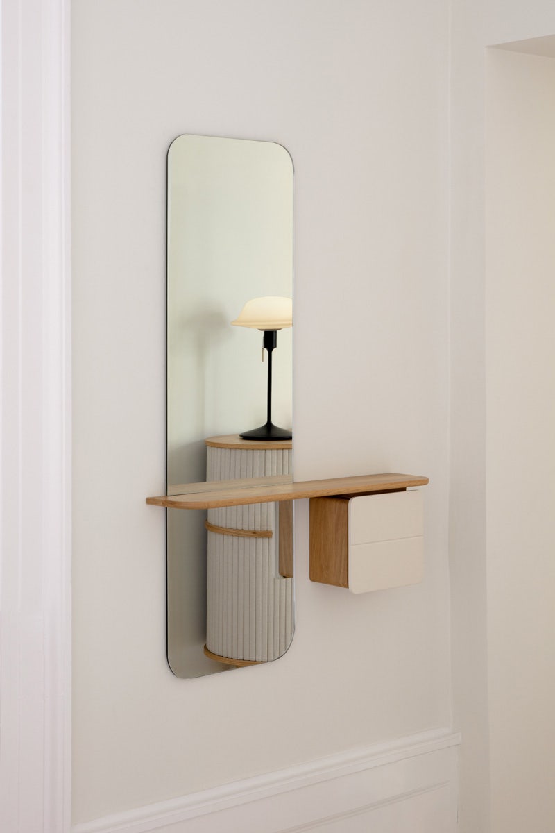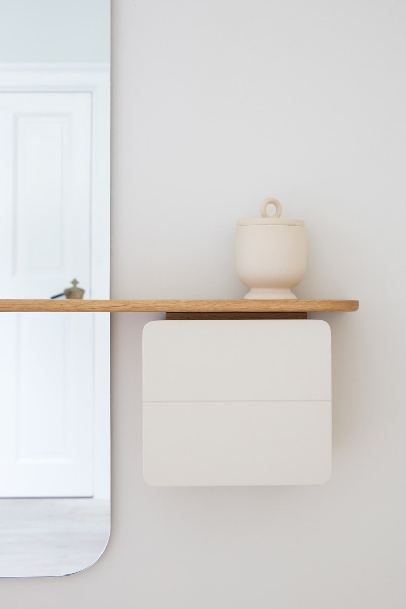 Het is niet alleen een spiegel, maar is veel meer dan dat. De spiegel is ontworpen om aan de muur op te hangen en wordt onder het midden gekruist door een massief houten plank waaraan een opbergkastje is bevestigd. In het opbergkastje zit een extra verwijderbare handspiegel en een extra plank. Deze prachtige wandspiegel is gemaakt van massief eikenhout en is afgewerkt met een opbergkastje. Het geheel heeft mooie afgeronde randen en rondingen, waardoor het een zachte, minimalistische uitstraling krijgt. Het deurtje van het opbergkastje is verkrijgbaar in meerdere kleuren, waardoor er altijd een kleur is die bij jouw stijl past. Bovendien biedt het geheel jou de mogelijkheid om al jouw spulletjes een mooi plekje te geven, waardoor je ze altijd bij de hand hebt wanneer je de deur uitgaat. Kortom, ben je op zoek naar een unieke spiegel, dan is de One More Look wandspiegel perfect voor jou!