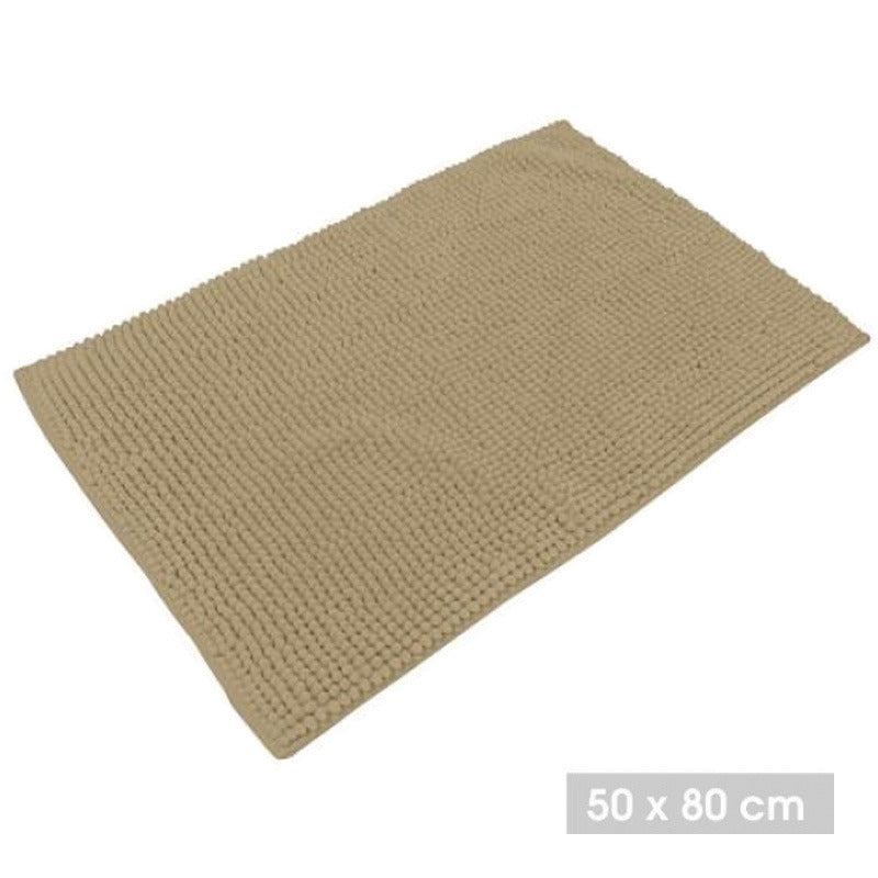 Badkamerkleed/badmat/badkamermat/tapijt/kleedje met anti-slip voor op de vloer in het toilet of badkamer in de kleur beige met afmetingen 50 x 80 cm in een rechthoekige vorm. De badkamermat is gemaakt van chenille stof(polyester), hierdoor is de mat zacht, kan voldoende water absorberen en voelt dit lekker warm aan je voeten. De mat heeft een eenvoudig basic noppen patroon. Stevige kwaliteit matten/badkamerkleedjes voor op de vloer van uw badkamer. Wasbaar op 30 graden. Merk: Urban Living.