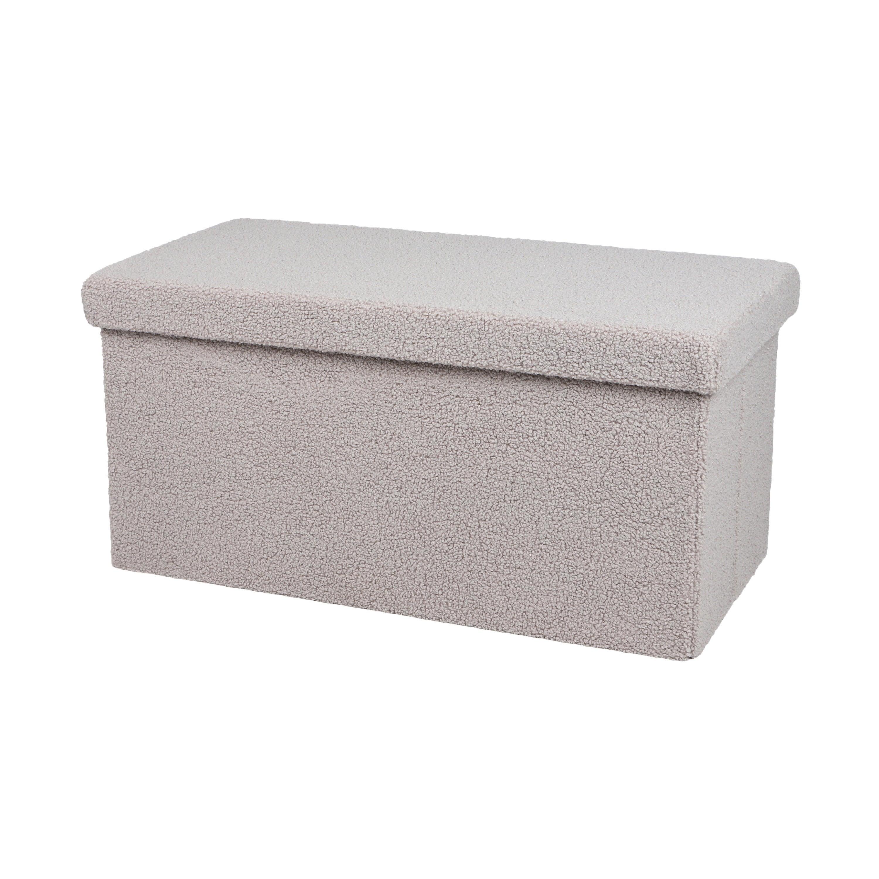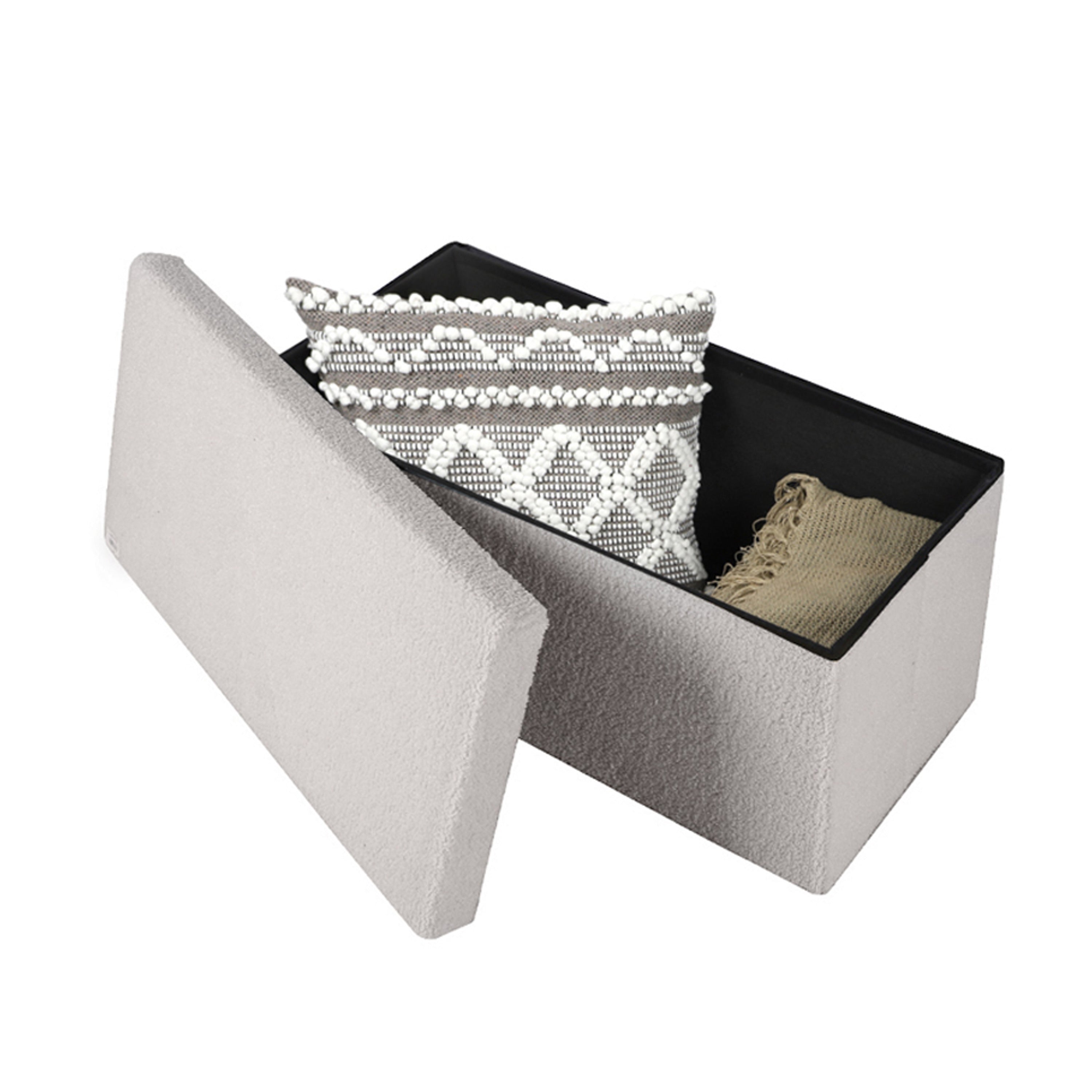 Hocker zit bankje of dubbel zits poef in noppen wol look met opbergruimte waar je ook op kan zitten. Deze opvouwbare poef, ook wel een hocker genoemd is ideaal voor elk huishouden. De poef heeft een afneembare deksel, geeft je extra opbergruimte en is tevens te gebruiken als voetenbankje. Bespaar ruimte door bijvoorbeeld speelgoed of dekens erin op te bergen of de poef als zitplaats te gebruiken. Een mooie aanvulling voor in huis. Kleur: lichtgrijs. Materiaal: polyester en mdf. Afmeting: ca. 76 x 38 x 38 cm. Makkelijk weer in te klappen en weg te leggen.
