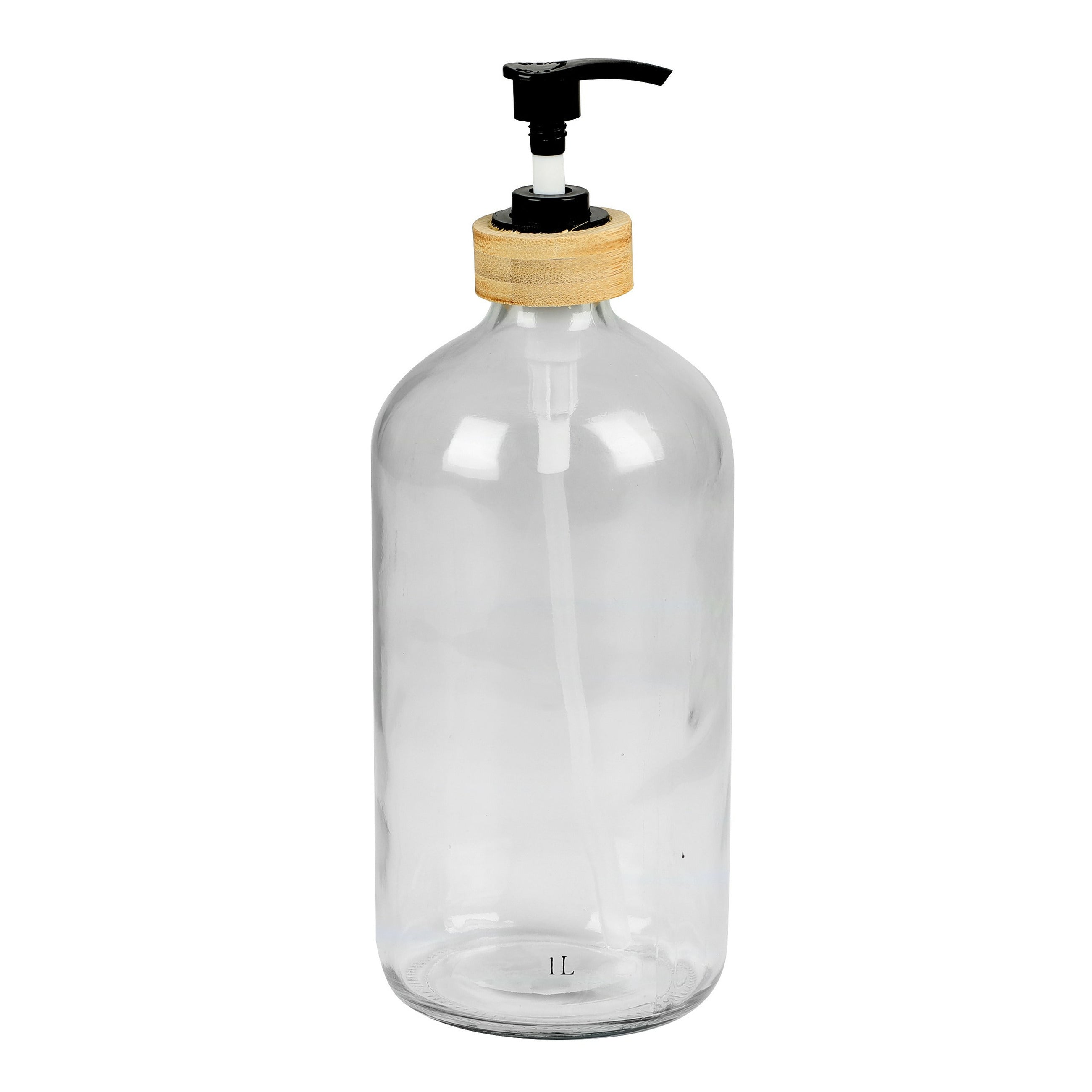 Urban Living zeeppompje/zeepdispenser van glas/kunststof/bamboe. Ideaal voor in de badkamer, keuken of het toilet. Afmetingen: ca. 9 x 24 cm. Inhoud: 1 liter. Stijlvol en praktisch tegelijk.