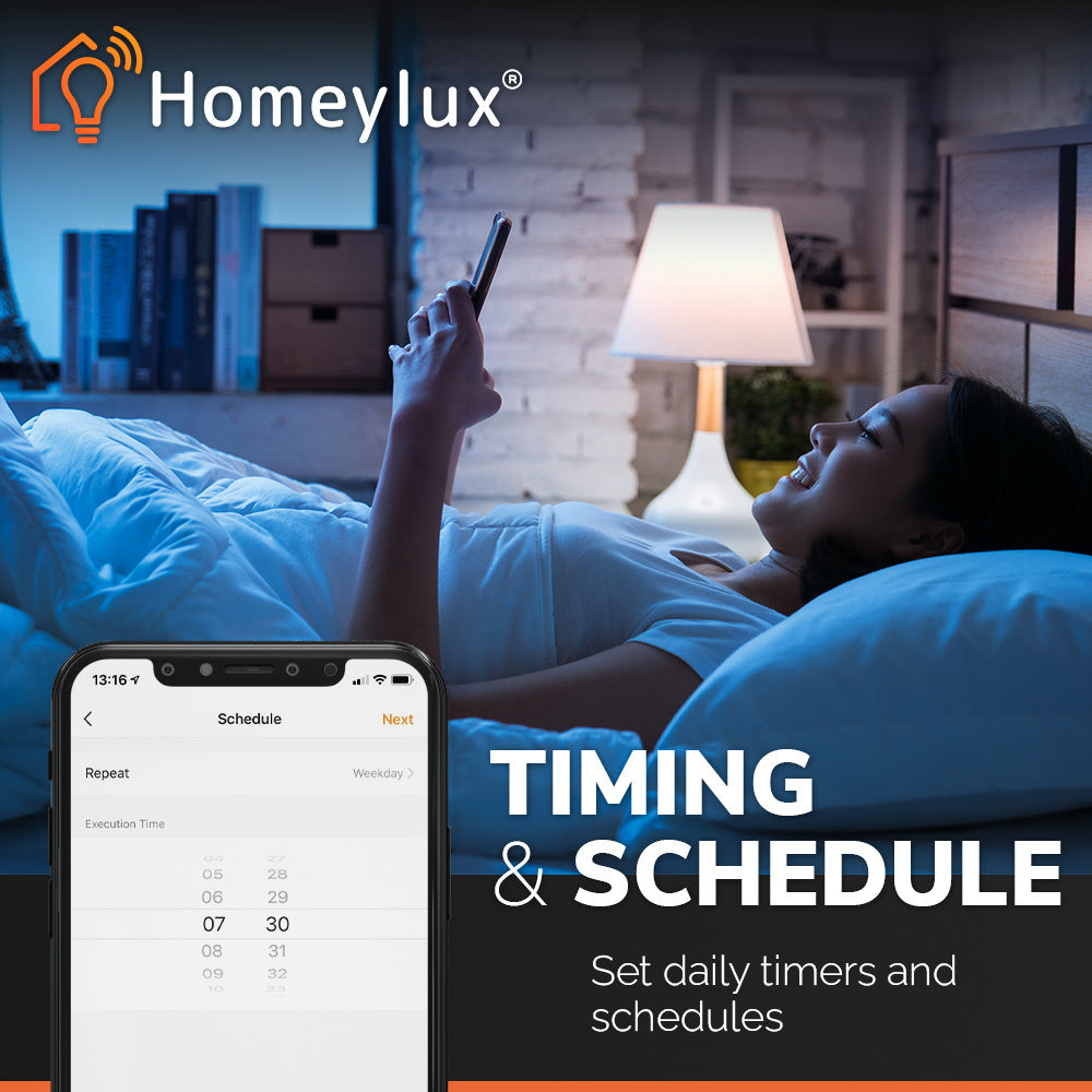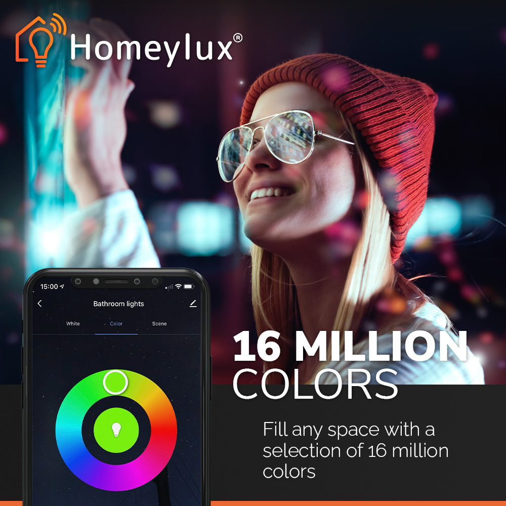 - Geniet van tientallen smart functies: planningen, GEOFencing, timers, dimmen en kiezen uit 16,5 miljoen kleuren.