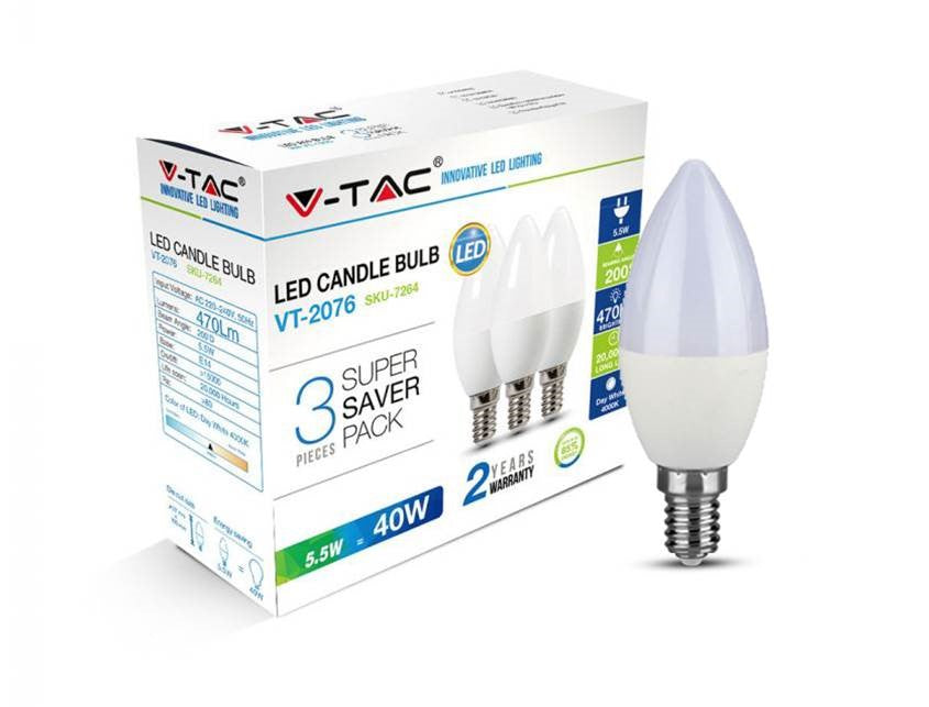 V-tac VT-2076 3-pack LED lampen kaars - E14 - 5.5W - 470 Lm - 2700K