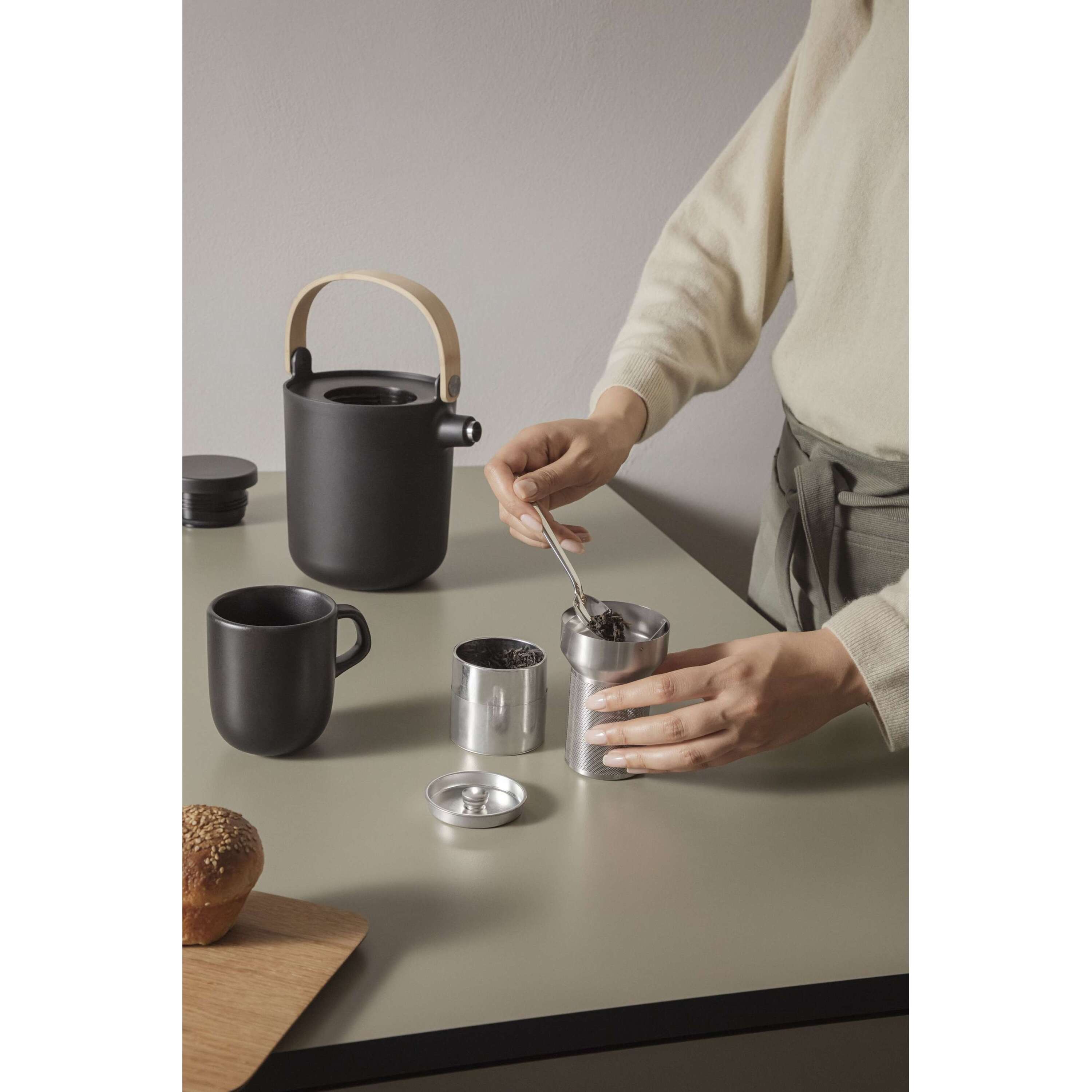 Strakke, moderne lijnen in combinatie met een natuurlijk bamboe accent. Dat is waar je de Nordic Kitchen thermoskan van Eva Solo aan kan herkennen. Het ontwerp is geïnspireerd op een theepot en onderscheid zich hiermee, mede dankzij de geïntegreerde theefilter, van de traditionele thermoskannen voor koffie. Vul de thermoskan met heet water en vul de theefilter met theeblaadjes welke je in het hete water kan laten trekken. De theefilter is eenvoudig te verwijderen wanneer de gewenste thee sterkte bereikt is. Het dubbelwandige RVS en kunststof zorgt, in combinatie met de deksel, voor een vacuüm geïsoleerde omgeving waardoor de thee urenlang warm blijft. Verder is de thermoskan 100% drupvrij wat vlekken op de tafel voorkomt. Na gebruik is de thermoskan eenvoudig schoon te spoelen onder de kraan waarna je de handgreep naar beneden kunt klappen om kastruimte te besparen. Omdat de handgreep is gemaakt van bamboe is het aan te raden om deze regelmatig in te smeren met olie om hem zo lang mogelijk in goede conditie te houden.