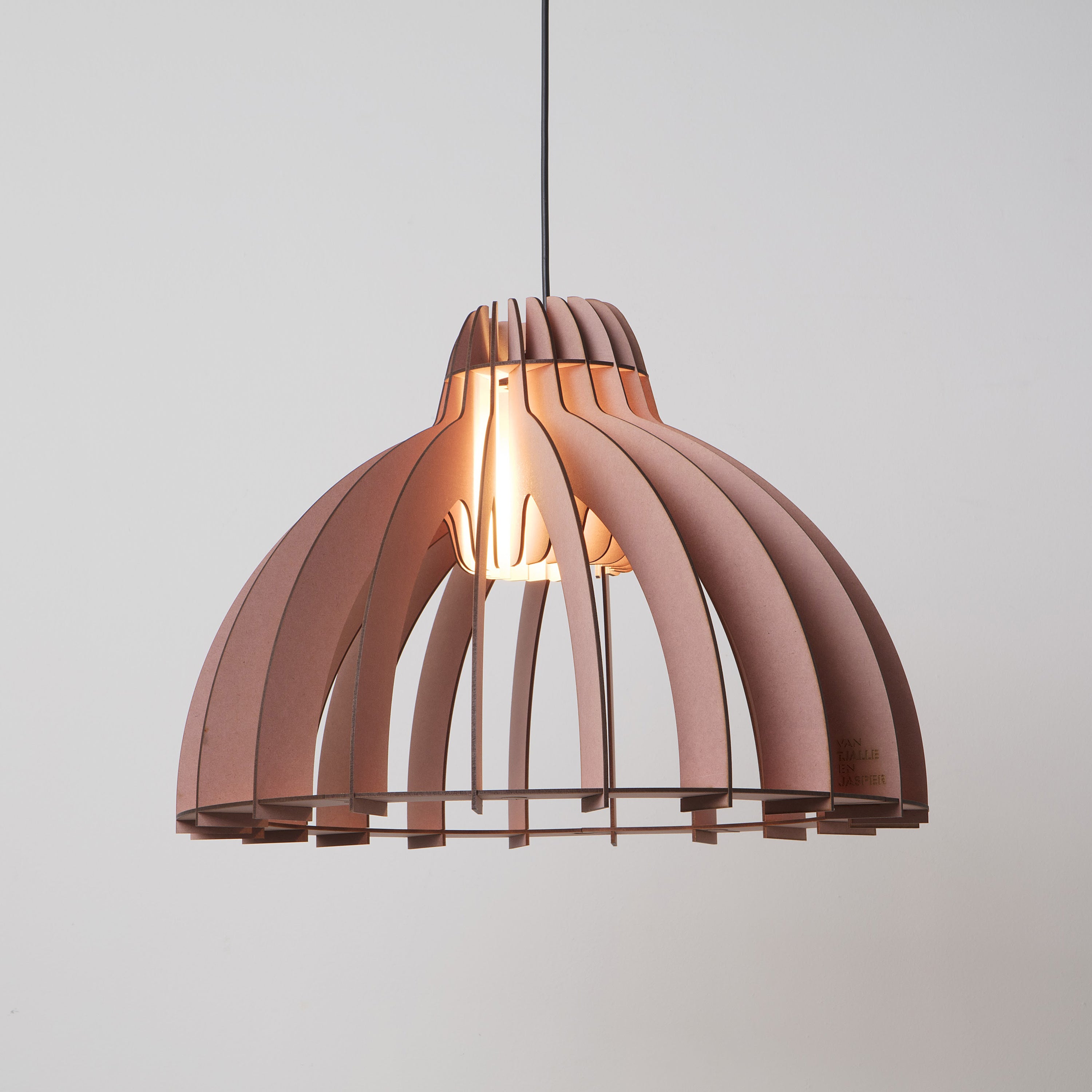 Met een laser gesneden De lamp is gemaakt van onbehandeld, lasergesneden MDF. Hierdoor heeft de lamp donkerbruine randen als gevolg van het lasersnijden. Alle andere onderdelen, zoals de kabel en fitting, zijn zwart en zijn gemaakt van kunststof, staal en koper.