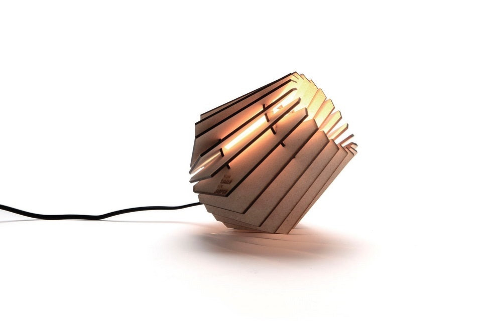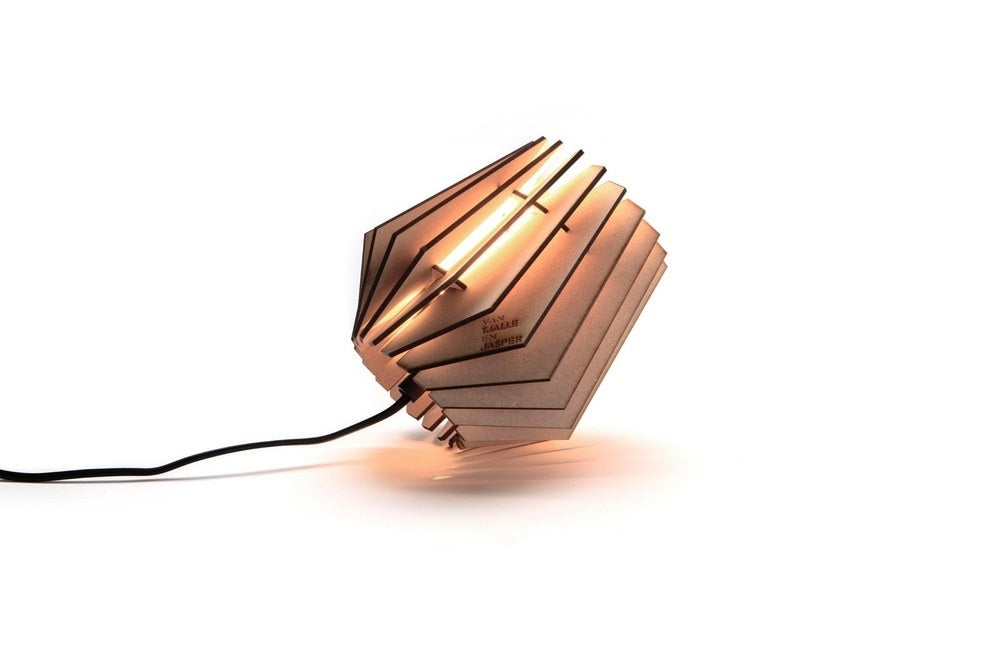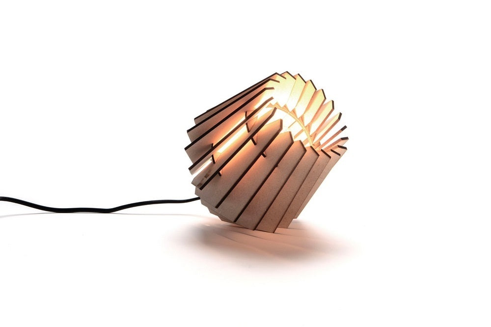 Gesneden met een laser De lamp is gemaakt van onbehandeld MDF. De stoere, donkere randen heeft de lamp te danken aan de manier van snijden. De onderdelen van de lamp worden namelijk door middel van een laser uit een stuk MDF hout gesneden. Gaaf hè?