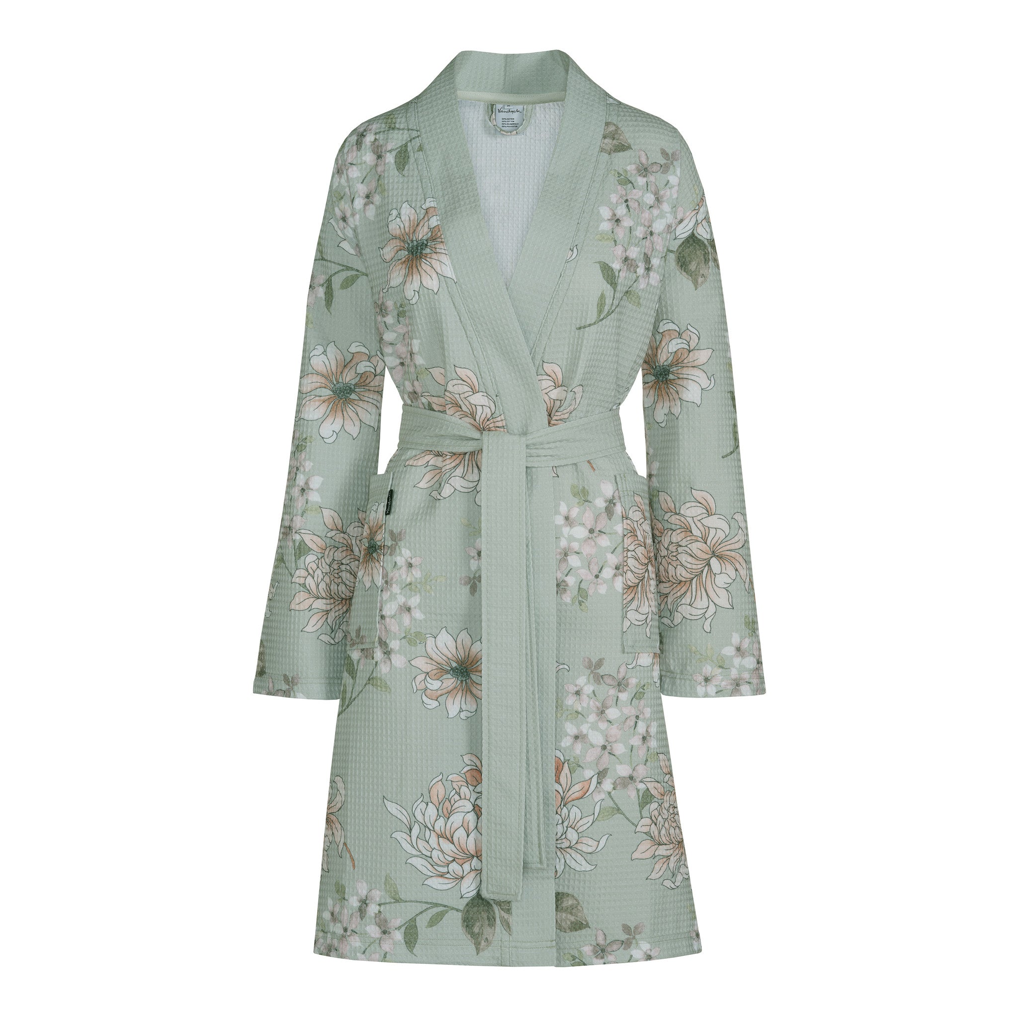 - De badjas heeft een wafelpique, kimonokraag, ceintuur en 2 diepe steekzakken.