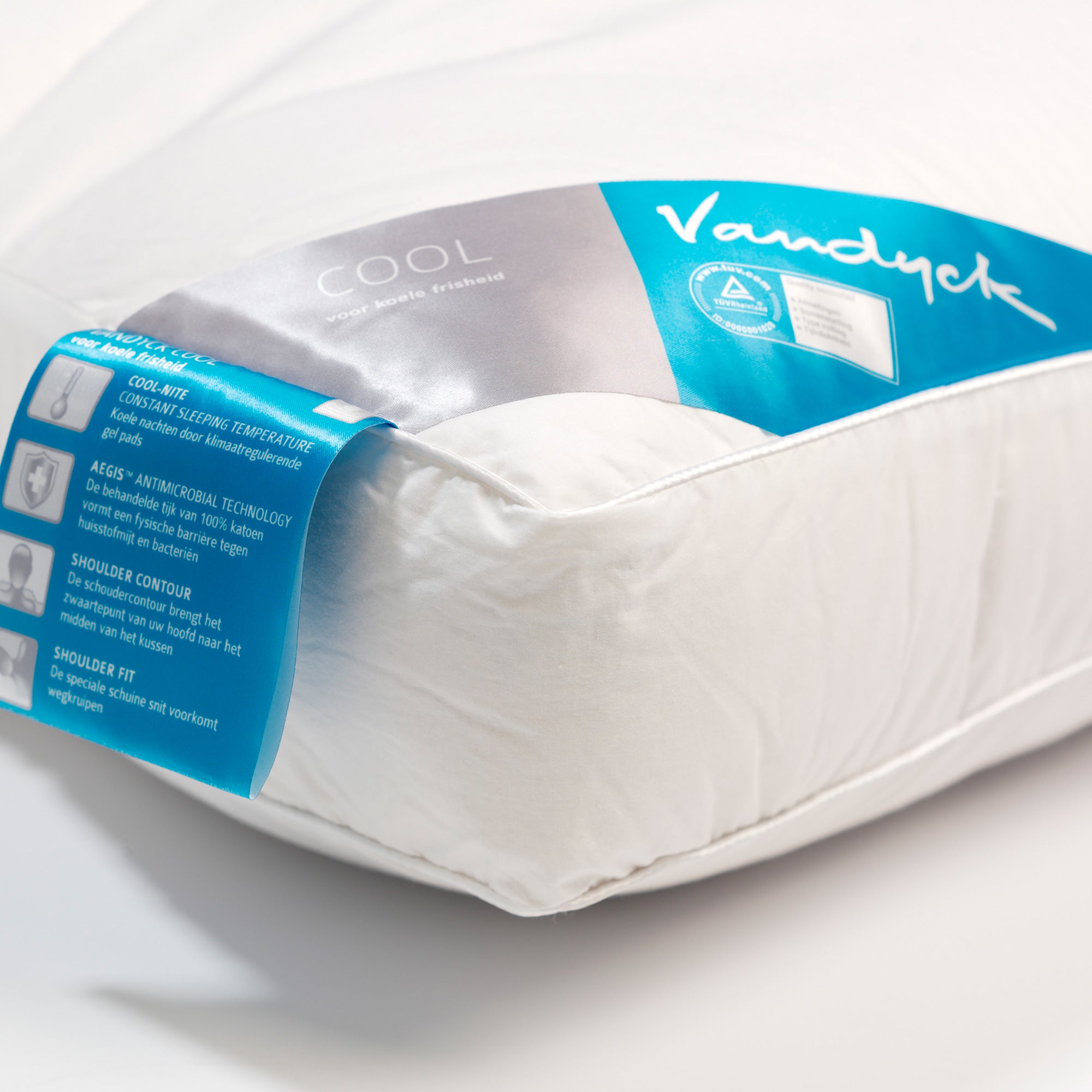 Vandyck Cool 4 hoofdkussen Het Cool hoofdkussen van Vandyck is perfect voor iedereen die het altijd warm heeft in bed. Onder de katoenen tijk zit een extra tijk die is voorzien van unieke, klimaatregulerende capsules die voor verkoeling zorgen tijdens warme nachten. Het kussen slaat de kamertemperatuur op en geeft deze af wanneer de temperatuur oploopt, hierdoor blijft je kussen dus altijd koel aanvoelen.
