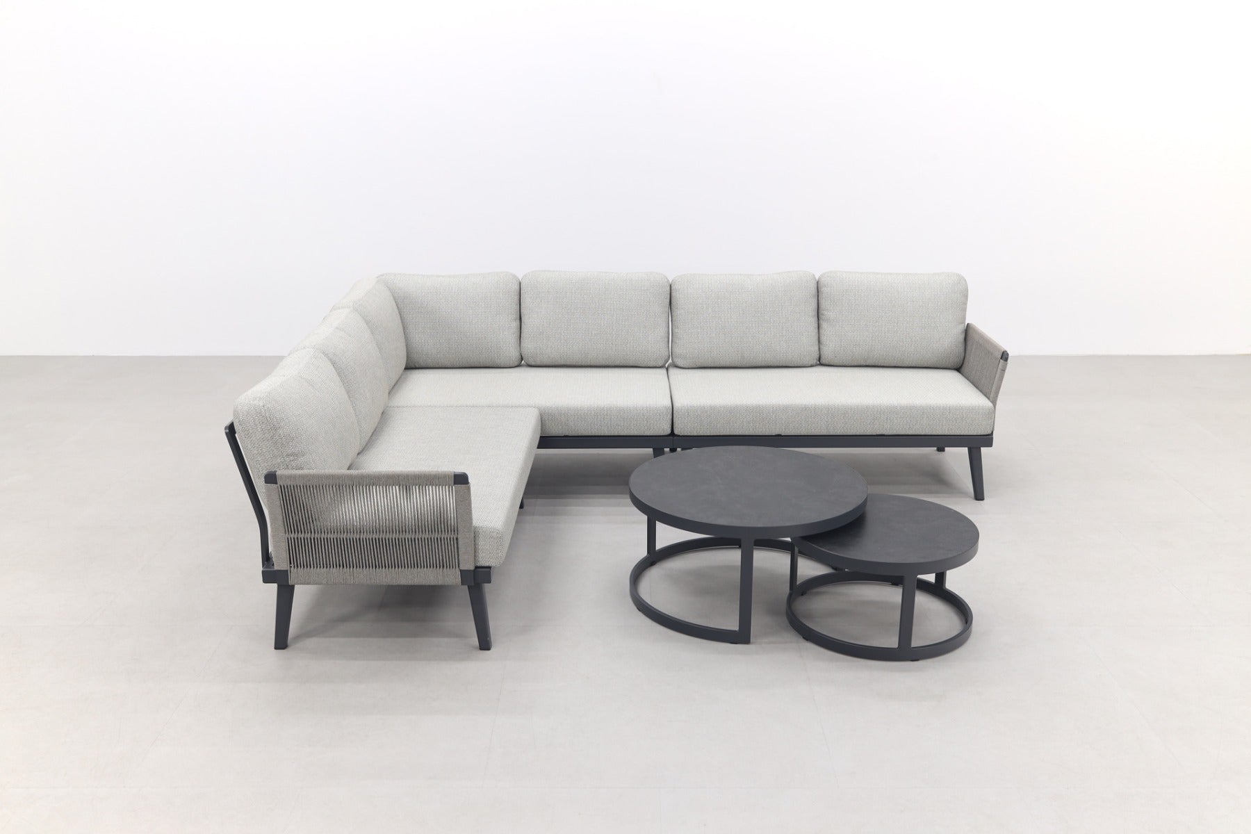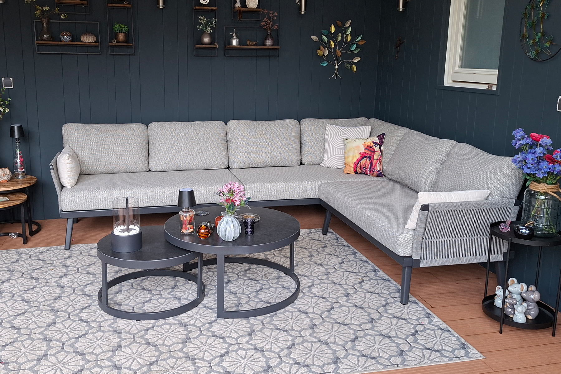 Geniet van ultieme ontspanning met de onze Durban loungeserie. Het frame is gemaakt van aluminium in antracietkleur. Aluminium wordt veel gebruikt in tuinmeubelen door zijn positieve eigenschappen. Zo is aluminium licht van gewicht, roestbestendig en gaat het lang mee. Zo is het niet alleen een prachtige keuze, ook een duurzame. De armleuningen zijn voorzien van een rope motief. Dit geeft een moderne uitstraling aan deze loungemeubels. Deze serie bestaat onder andere uit loungestoelen, loungebank en een hoekbank. Door de licht grijze kussens ben je voorzien van een heerlijk zitcomfort waardoor je graag gaat zitten.