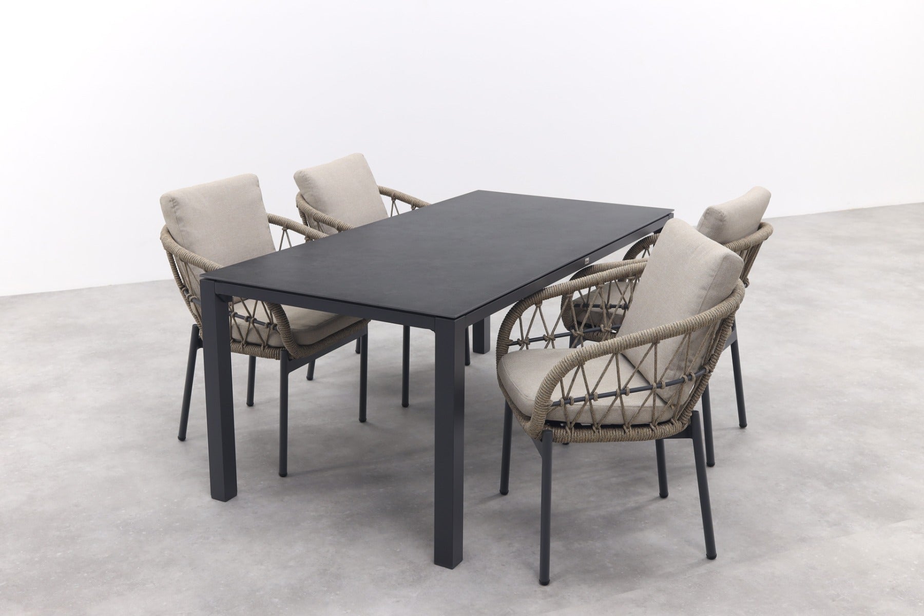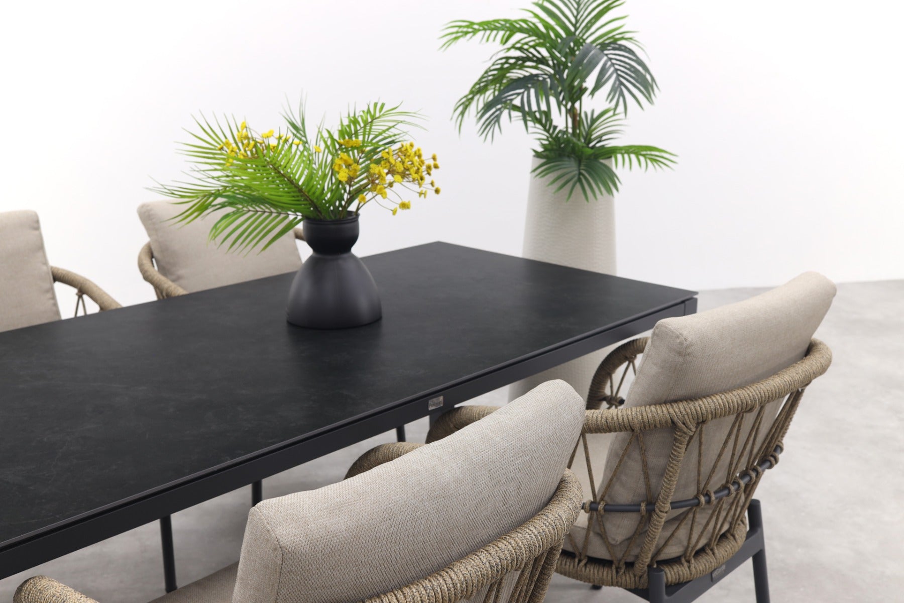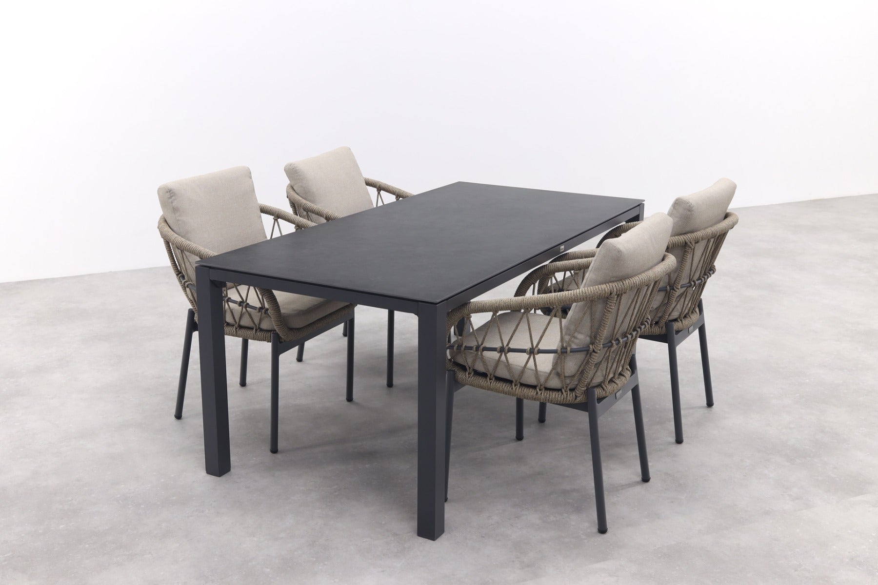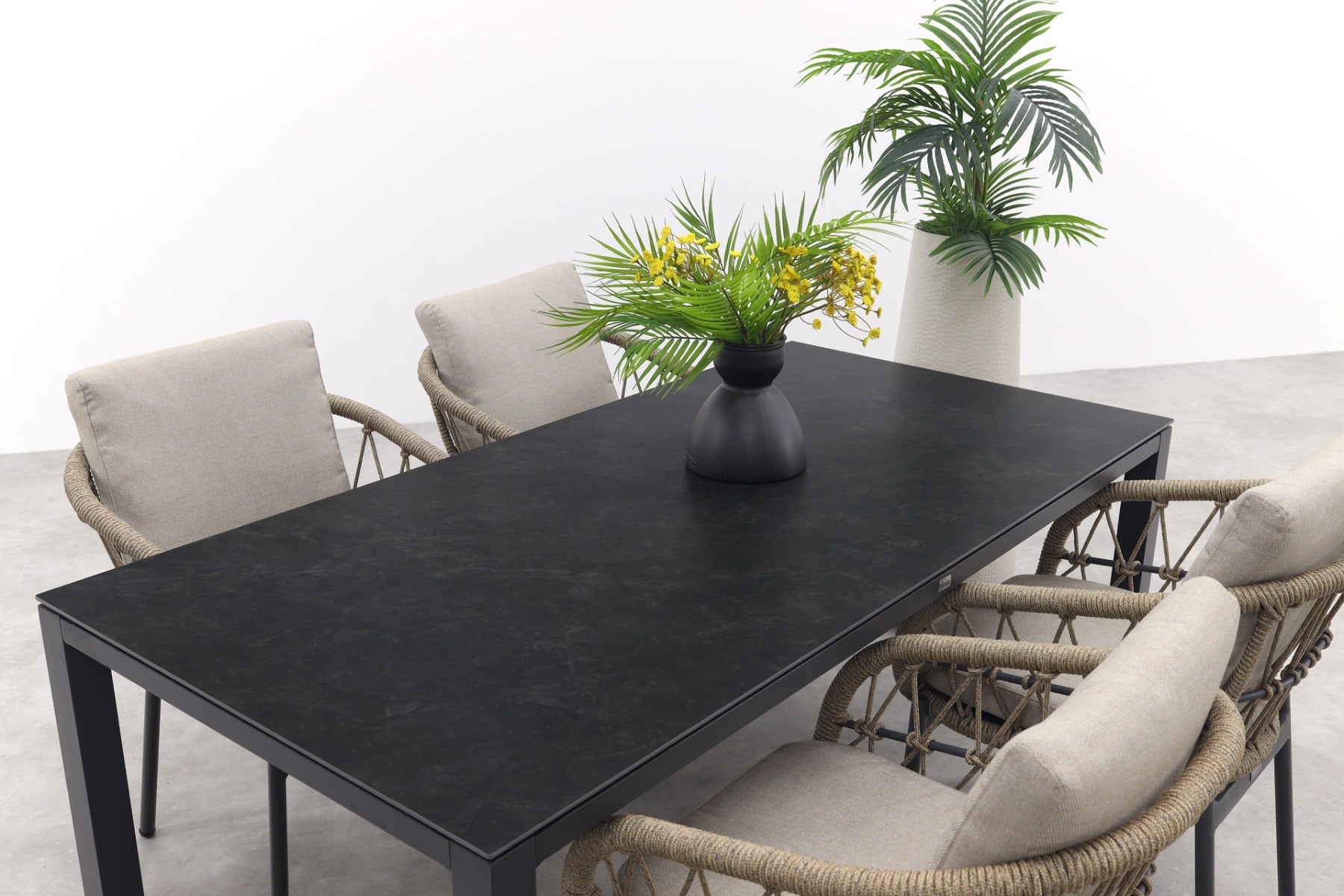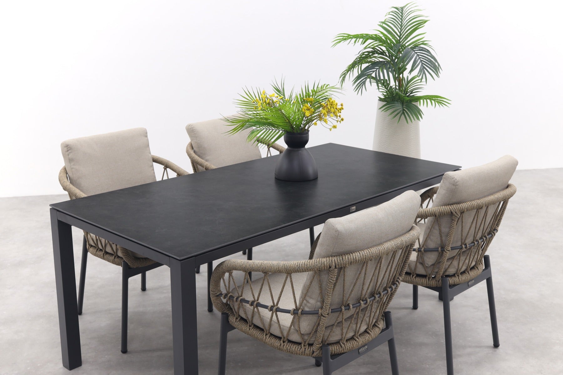 De Julia/Chaneo tuinset heeft een eigentijdse uitstraling en een stijlvol design. Hou jij van een bakje koffie in de tuin of borrelen met vrienden? Dan kan deze tuinset niet ontbreken in jouw buitenruimte. De Julia dining tuinstoel is te herkennen aan het unieke rope touwpatroon. De elegante afwerking van het rope zorgt niet alleen voor een stijlvolle uitstraling, maar ook voor comfort. De lichte kleuren van het rope passen perfect bij het antraciet van de Chaneo tuintafel. Het keramische tafelblad met betonlook motief voegt een stoere look toe aan deze tuinset. Het tafelblad wordt gecombineerd met een stevig aluminium frame. Kom gezellig langs in één van onze showrooms in Opheusden, Duiven of Apeldoorn. Ervaar het zitcomfort zelf en doe inspiratie op voor jouw buitenruimte.