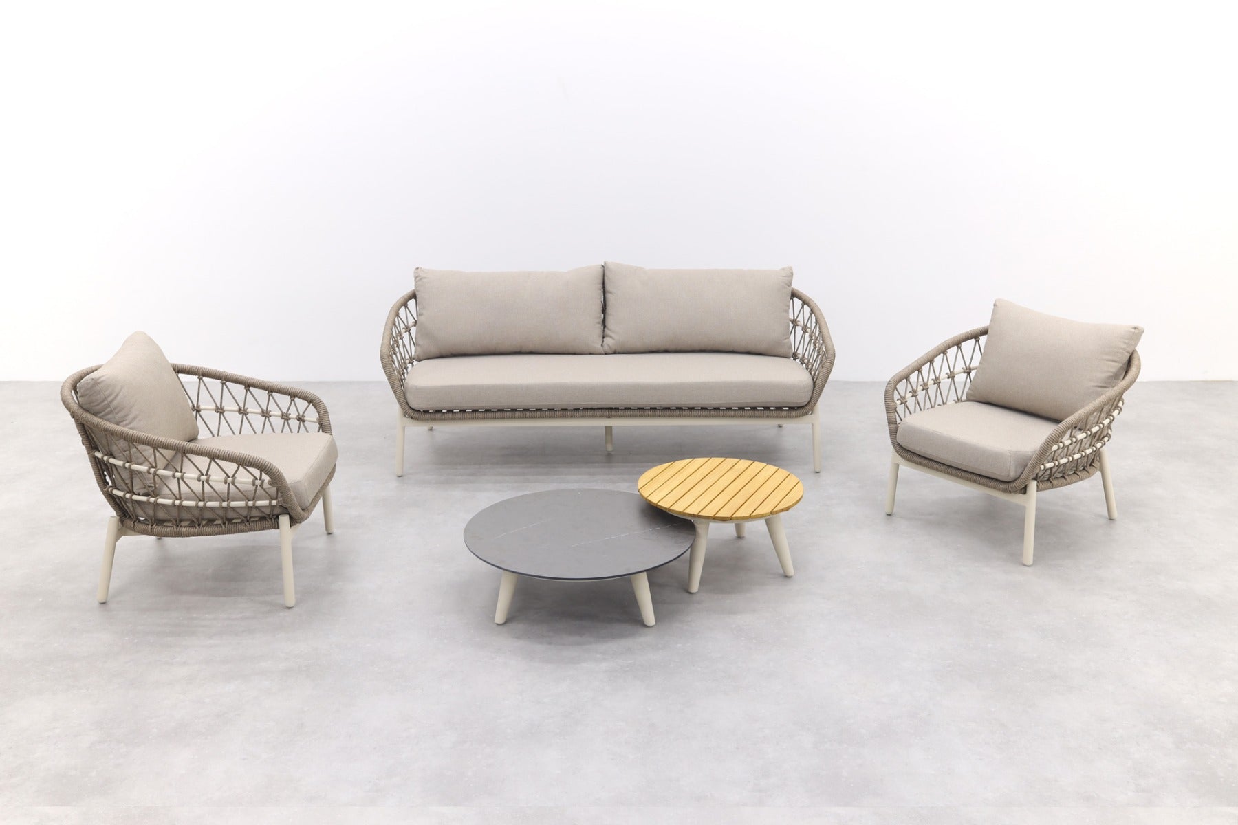 De basis van deze loungeset is gemaakt van lichtgewicht aluminium. Aluminium is onderhoudsvriendelijk en volledig roestvrij. Het frame is afgewerkt met een antraciet coating die niet alleen kras- en stootvast is, maar ook het mooi design benadrukt. Mocht het frame onverhoopt vuil worden, dan is het eenvoudig te reinigen met water en zeep. De zittingen en rugleuningen zijn gemaakt van duurzaam rope, wat zorgt voor een unieke en stijlvolle uitstraling. De loungetafels hebben net als de set een aluminium frame. Het ene tafeltje heeft een teak houten blad en de andere heeft keramiek op glas tafelblad. Dit combinatie van deze materialen zorgen voor een fantastische uitstraling.