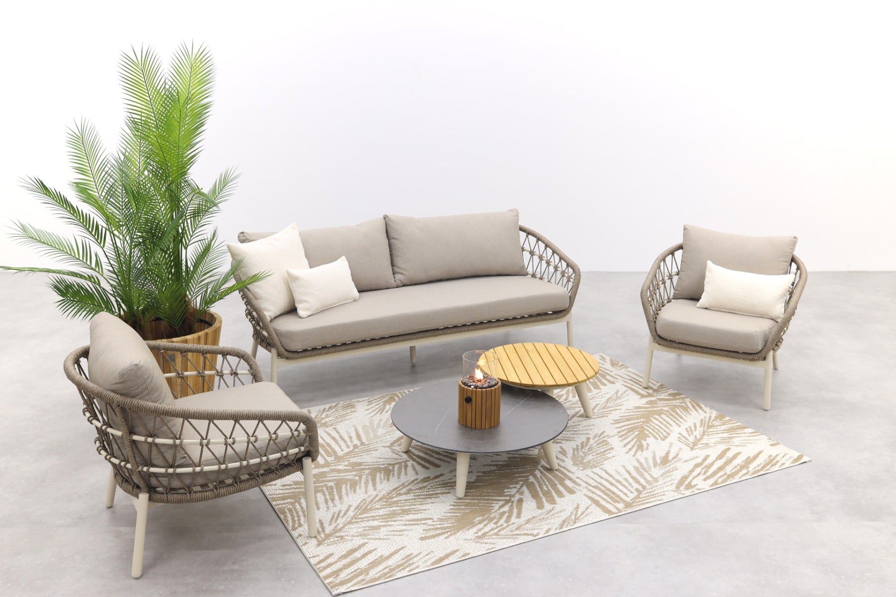 Ontdek de Julia loungeset in oyster kleur frame (beige) — Een trendy keuze voor elke tuin! Op zoek naar een loungeset die moderniteit en comfort feilloos combineert? Kijk dan niet verder. De julia loungeset set springt in het oog met zijn stijlvolle design en trendy rope afwerking, waardoor het de ultieme blikvanger in je tuin wordt. Om het aluminium frame is rope gemaakt in een bruin tint. Dit zorgt voor een luchtige en moderne uitstraling. Of je nu ontspant met een boek of geniet van gezellige momenten met vrienden en familie, de Julia loungeset biedt de perfecte setting.