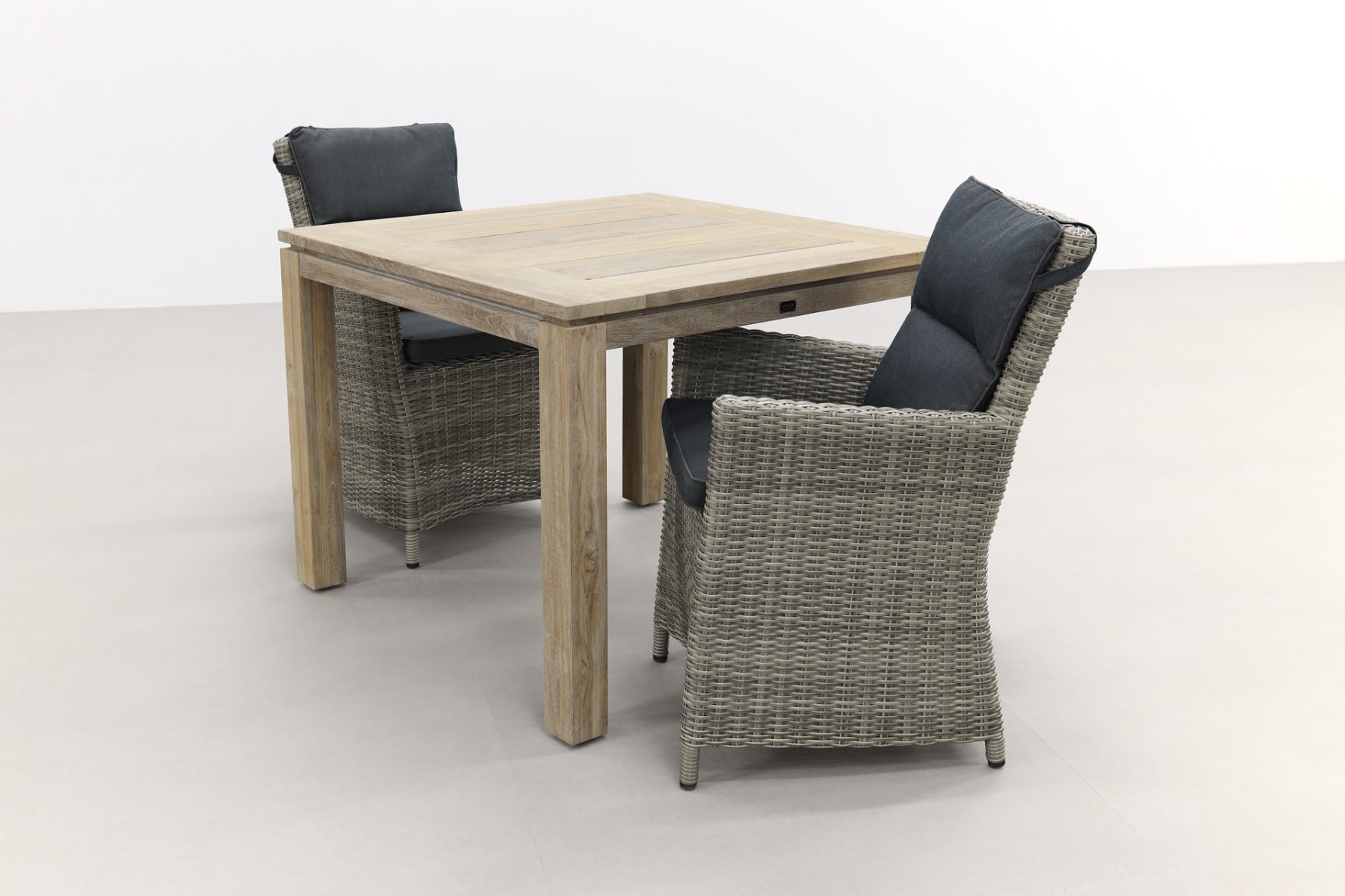 Tijdloze Mante/Rome tuinset: comfortabele Mante tuinstoelen met Paloma grijs wicker en hoge rugleuning, gecombineerd met een compacte Rome teakhouten tuintafel met grey wash.