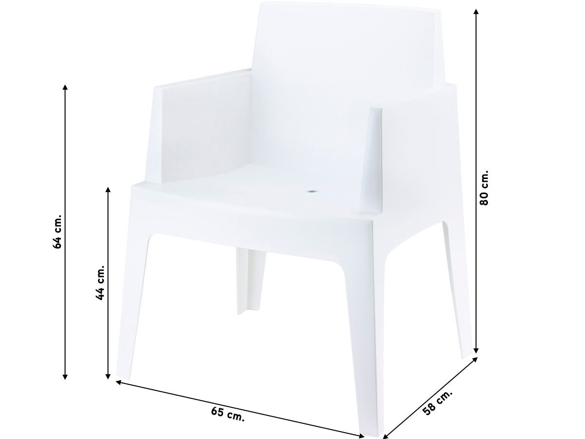 De Siesta Box stapelbare stoel wit is gemaakt van 100% polypropyleen een zeer hoogwaardige kunststof. Dit materiaal is kleurvast, krasbestendig, 100% UV-bestendig en eenvoudig schoon te houden. De Siesta Box stapelbare stoel wit heeft een klein gaatje in het zitgedeelte zodat het water altijd afgevoerd wordt na een regenbui. U kunt de stoel schoon maken met een lauwwarm sopje. Gebruik hierbij altijd een spons of zachte doek. De Sieste Box stapelbare stoel wit heeft een zithoogte van 44 cm. en een armleuninghoogte van 64 cm.