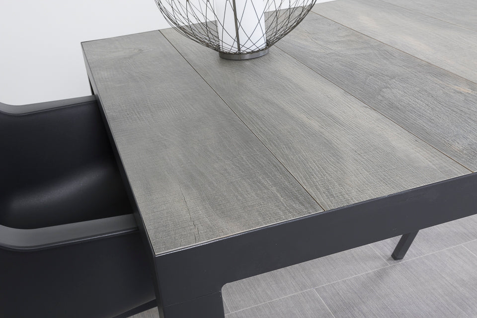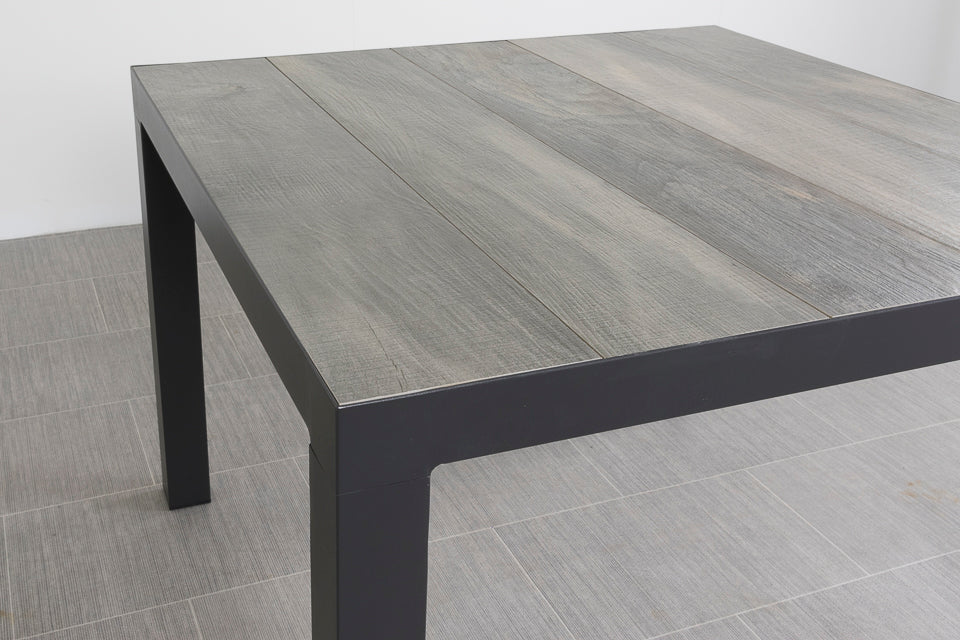 De Kings tuintafel heeft net als de tuinstoelen een aluminium frame. Het tafelblad van de tuintafel is gemaakt van keramiek en voorzien van een houtlook. Dit geeft de tuintafel een warme uitstraling en staat tevens mooi in contrast met het antracietkleurige frame. Met zijn afmetingen van 100x100 cm. biedt de tafel plaats aan 2-4 personen.