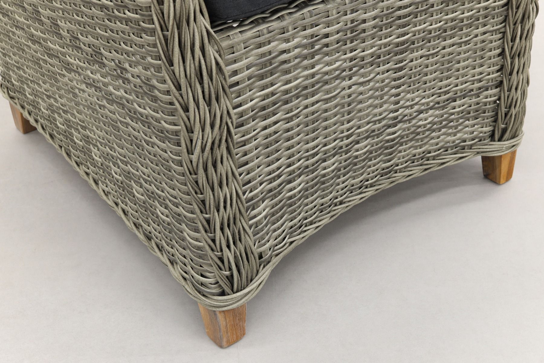 De Torino tuinstoel is gemaakt van hoogwaardige materialen en heeft een hoog zitcomfort. De wicker tuinstoel is uitgerust met een zit- en rugkussen. Het rugkussen is gecapitonneerd waardoor de tuinstoel een luxe uitstraling krijgt. Het frame van de Torino tuinstoel is gemaakt van stevig aluminium. Dit materiaal is licht in gewicht, onderhoudsarm en heeft een lange levensduur. Om dit frame is het halfronde wicker gevlochten. Het wicker is uitgevoerd in de kleur paloma grijs en is het beste te beschrijven als een mix van grijstinten.