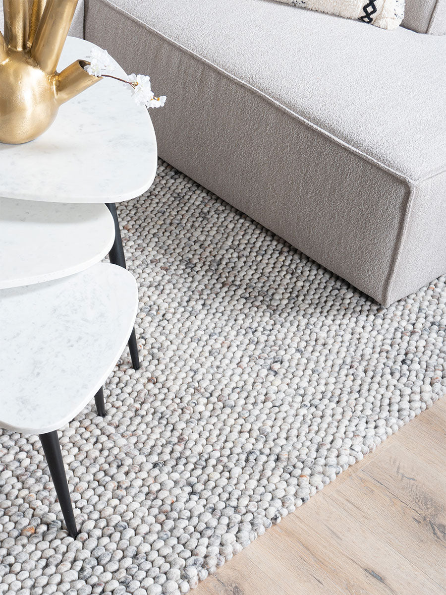 - De unieke structuur, geïnspireerd op stenen, voelt dankzij het 100% wollen materiaal zacht aan onder je voeten