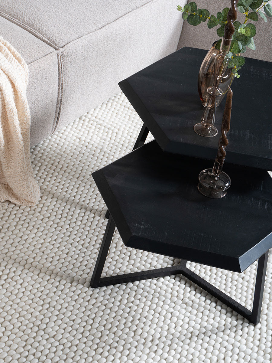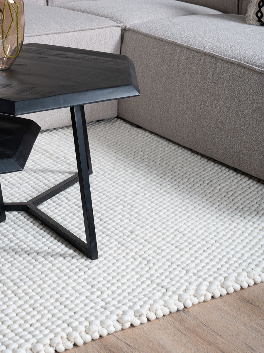 - De unieke structuur, geïnspireerd op stenen, voelt dankzij het 100% wollen materiaal zacht aan onder je voeten