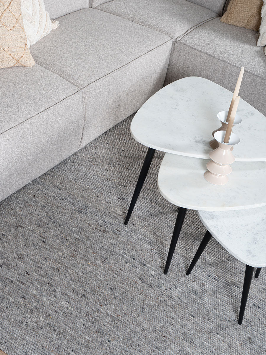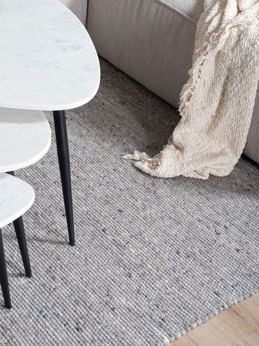 - Vloerkleed Scott, een wollen tapijt met een platgeweven structuur, voegt direct warmte toe aan jouw interieur