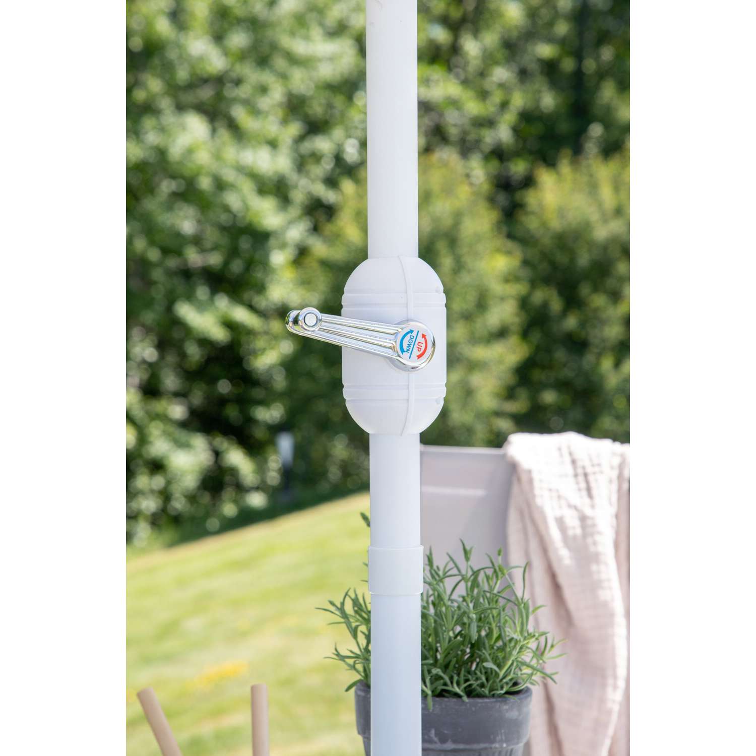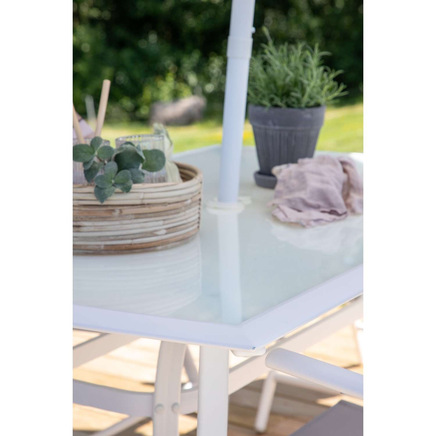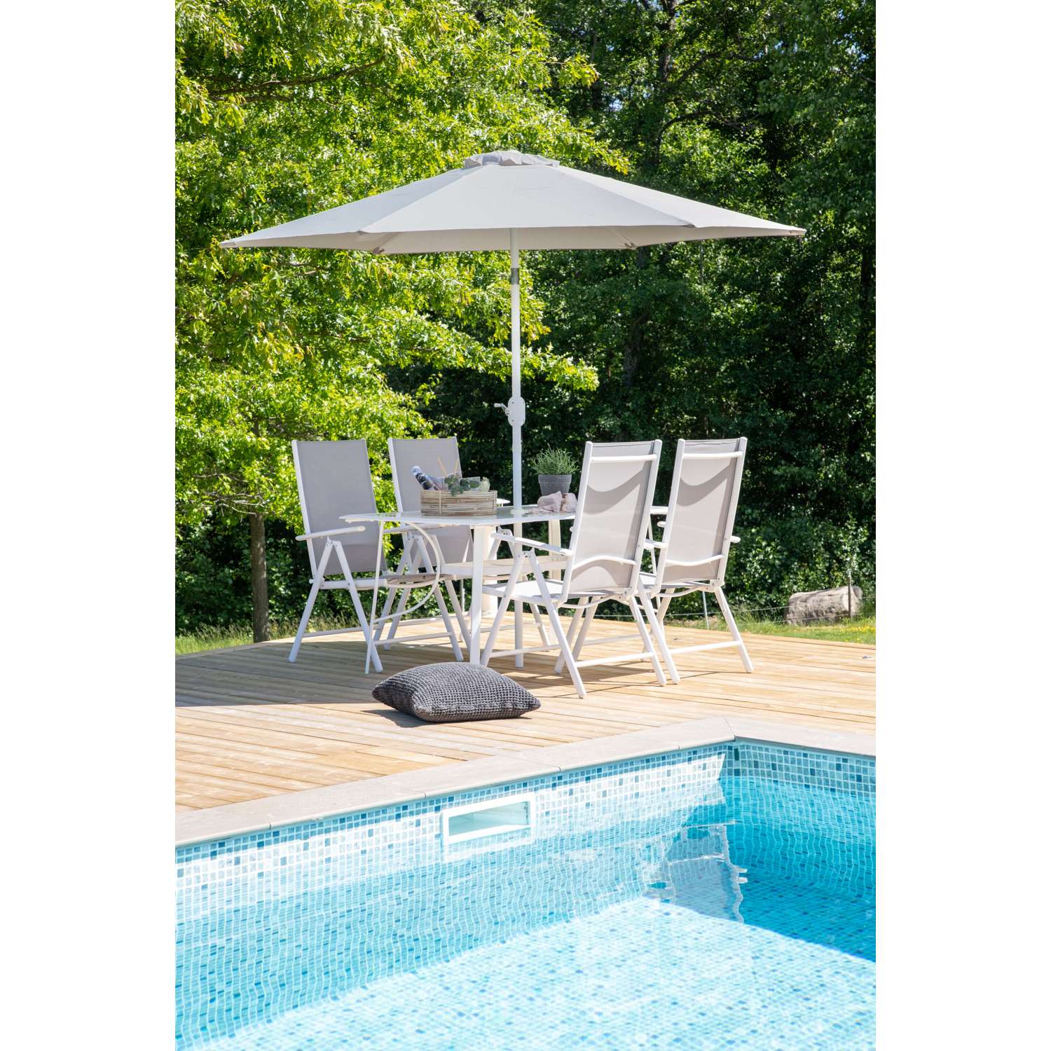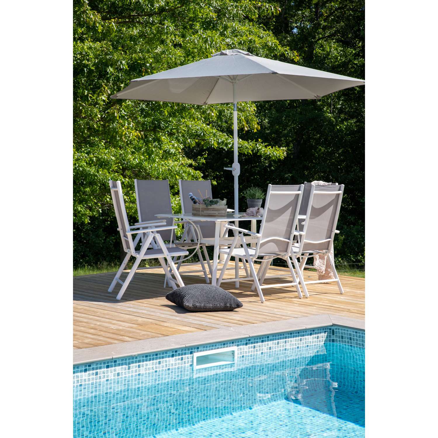 - Hierbij horen inklapbare eetstoelen met een zitting van grijze textiel en een frame van wit aluminium