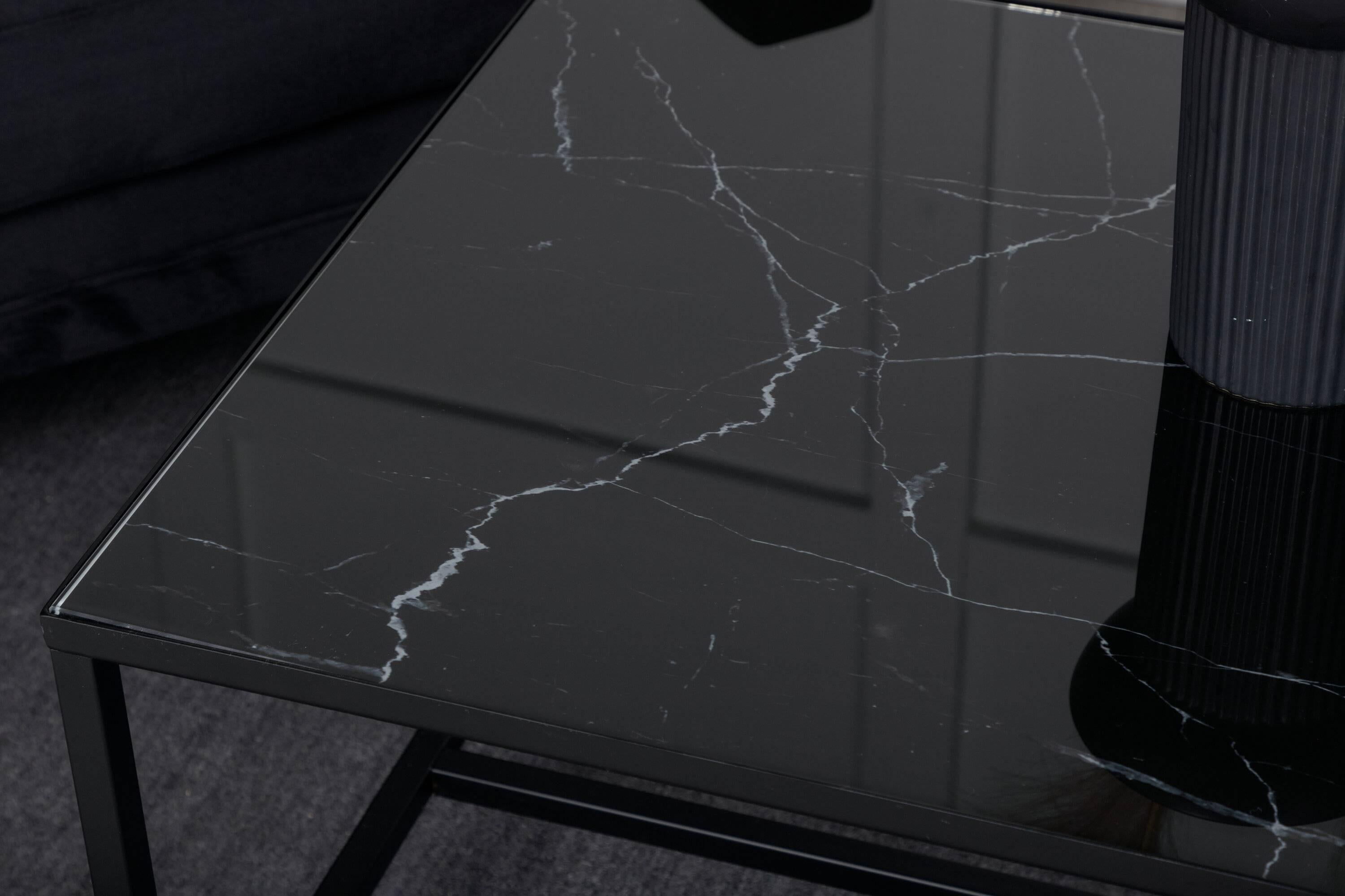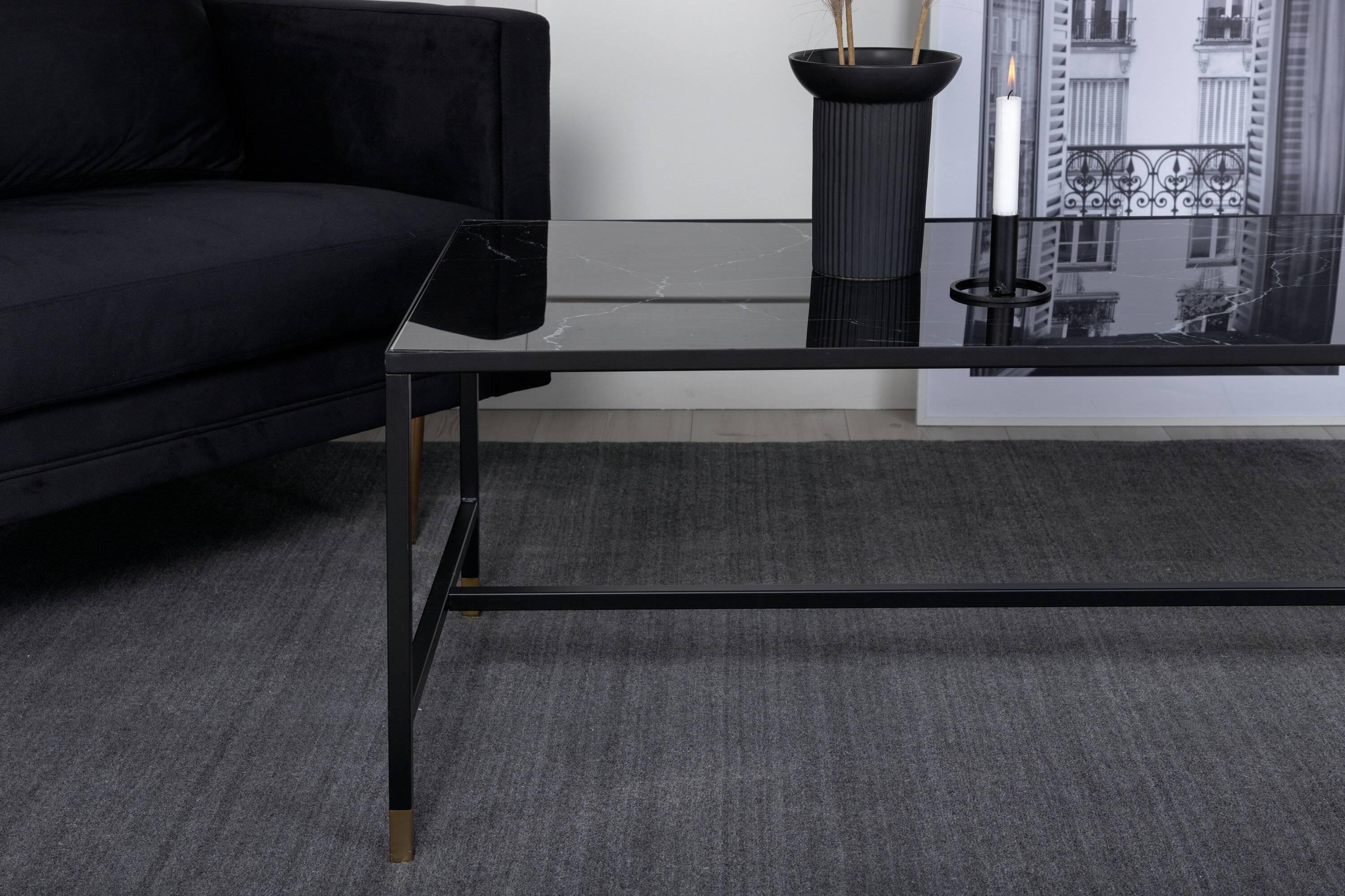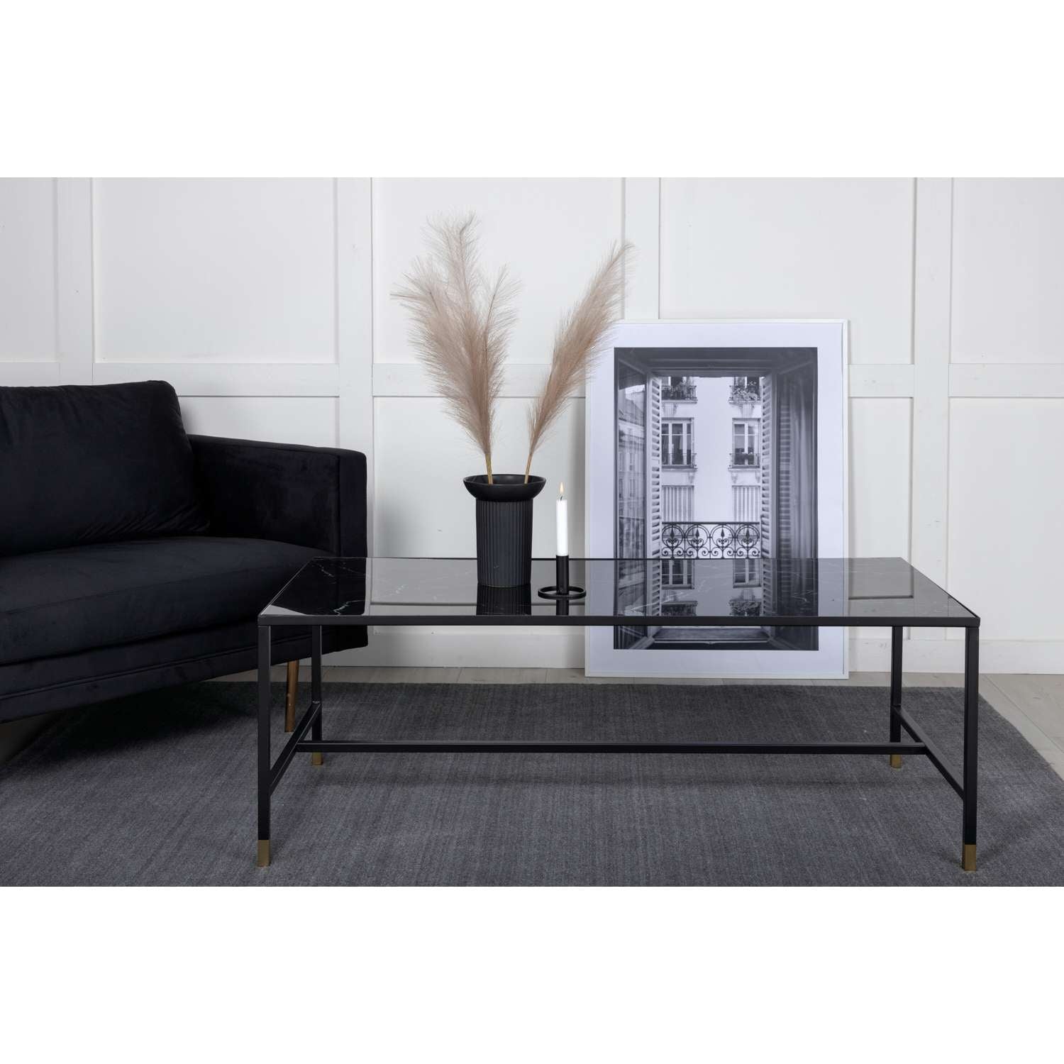 De salontafel Dipp heeft een licht gemarmerd tafelblad van glas en een onderstel van zwart metaal met messingkleurige pootuiteinden.